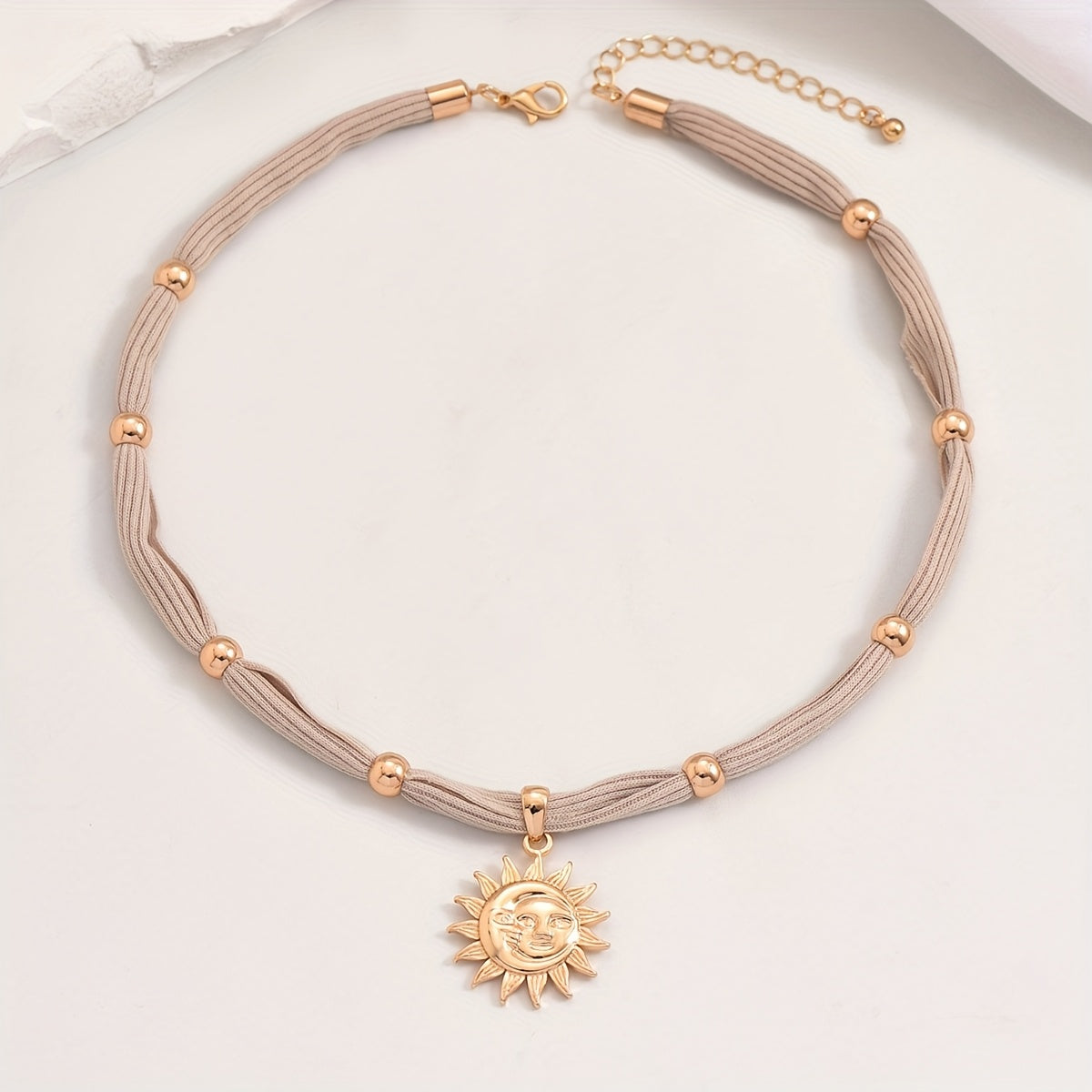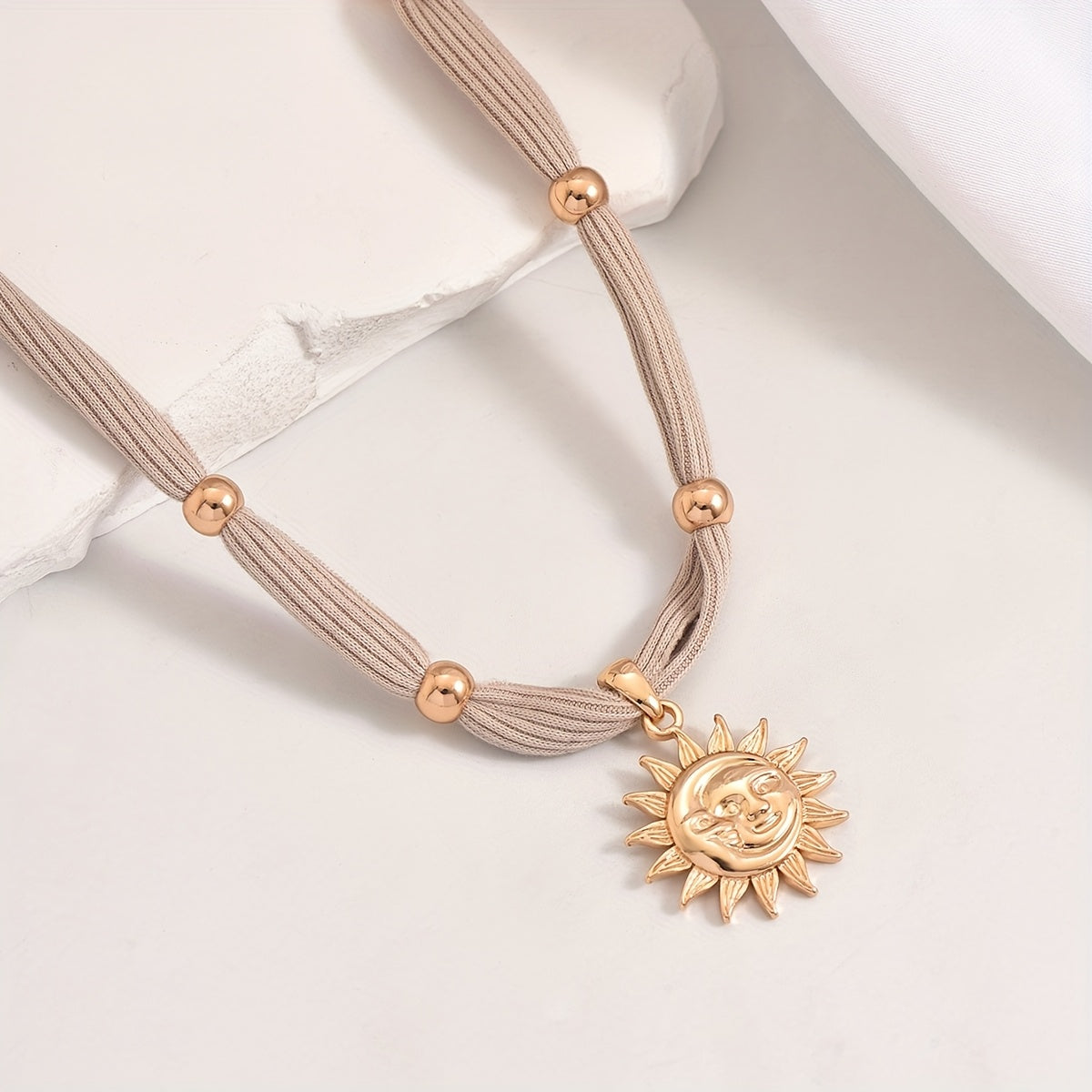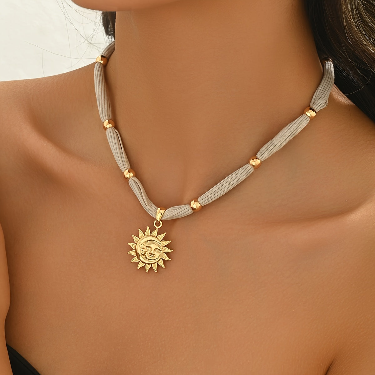 ✨ Colgante de sol en un suave cordón textil con detalles metálicos dorados.