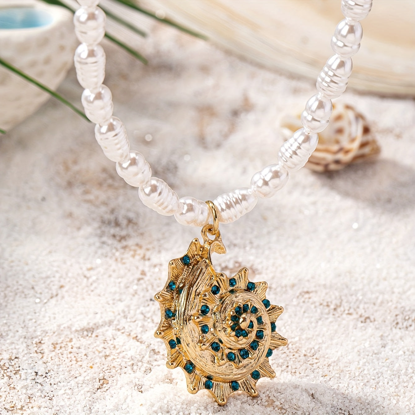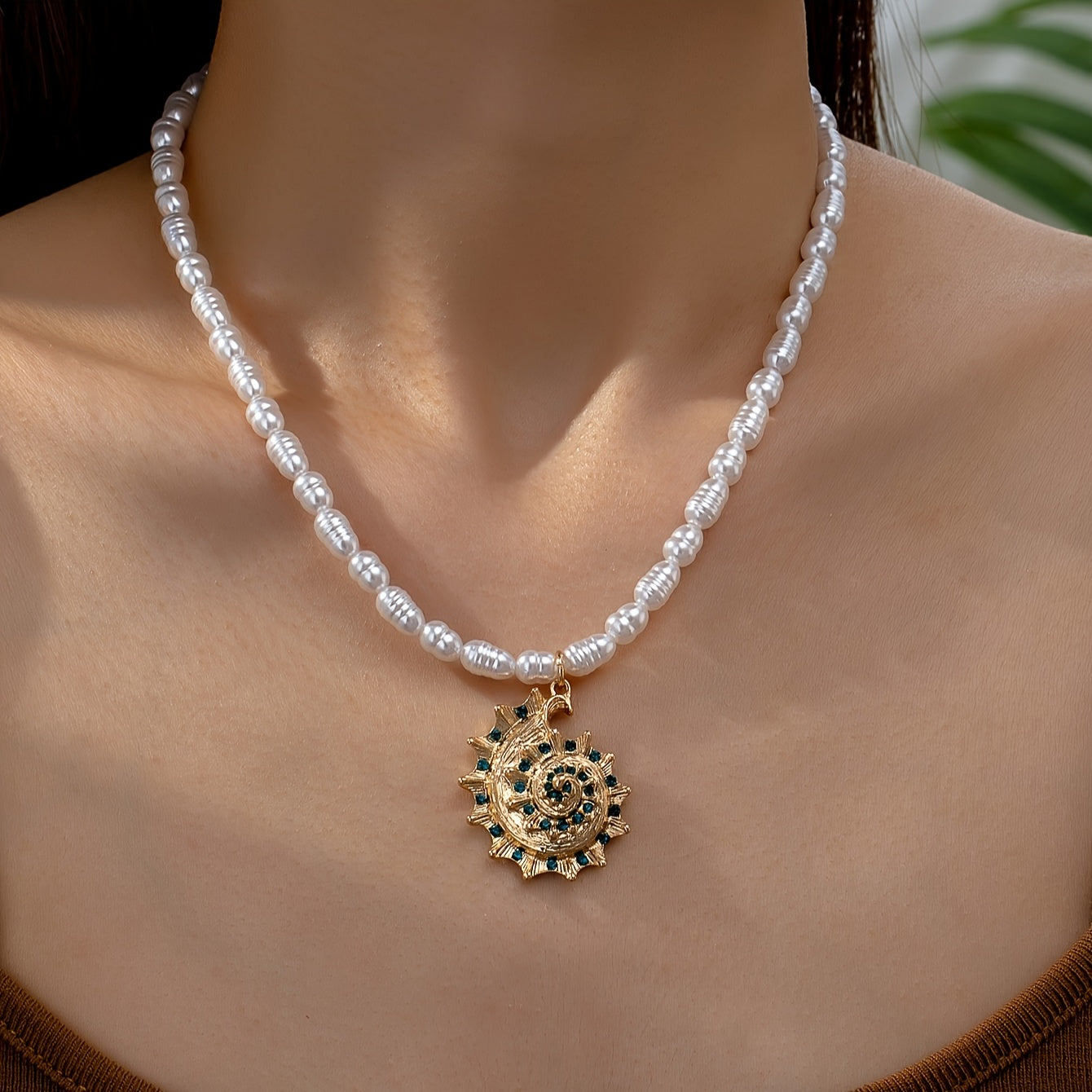 ✨ Colgante de concha en espiral con detalles de cristal en un hilo de cuentas de perlas, acabado en metal dorado.