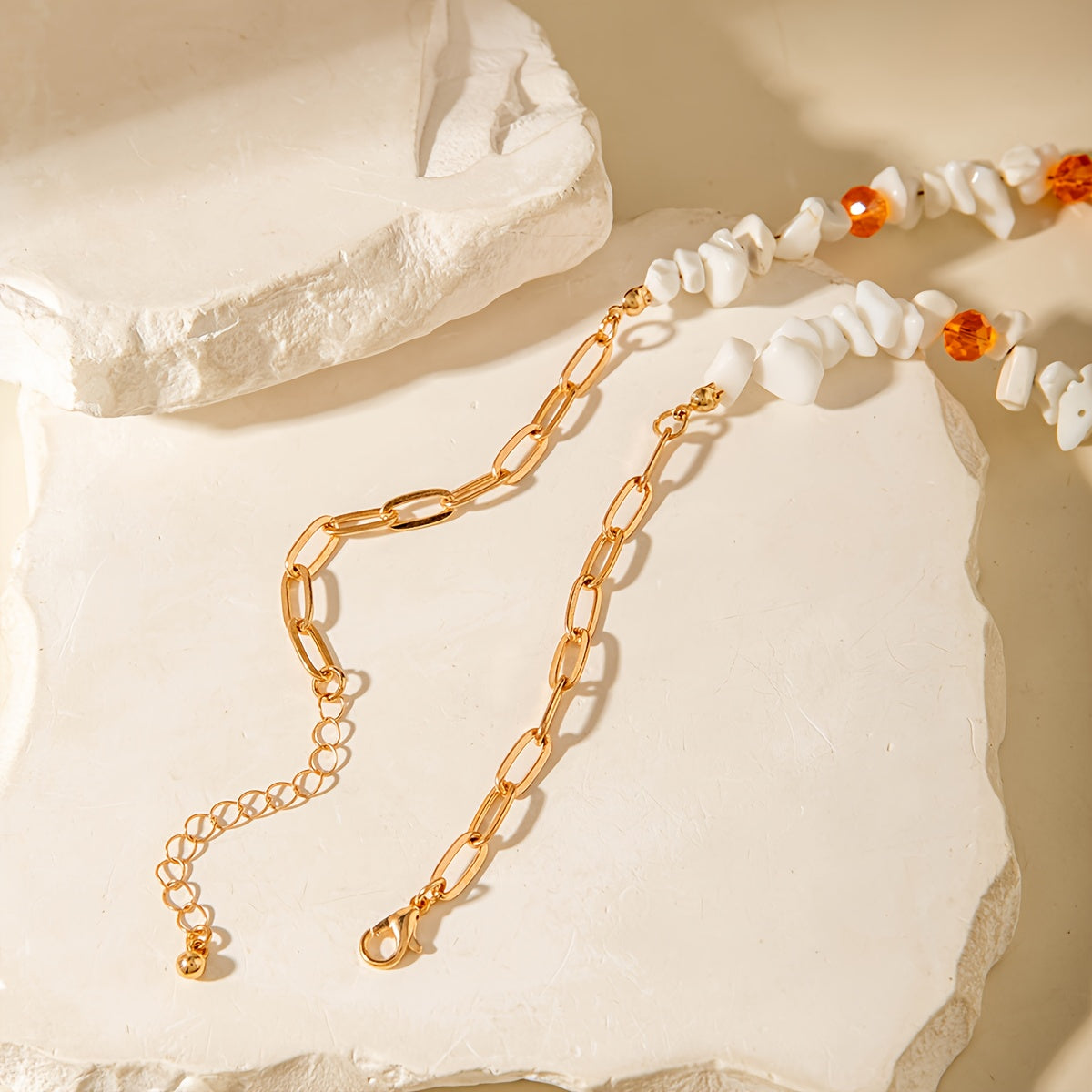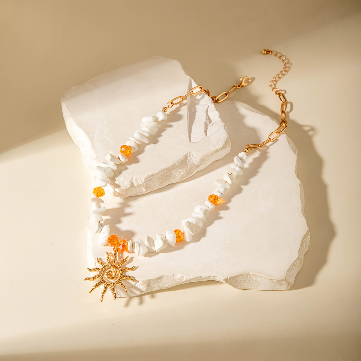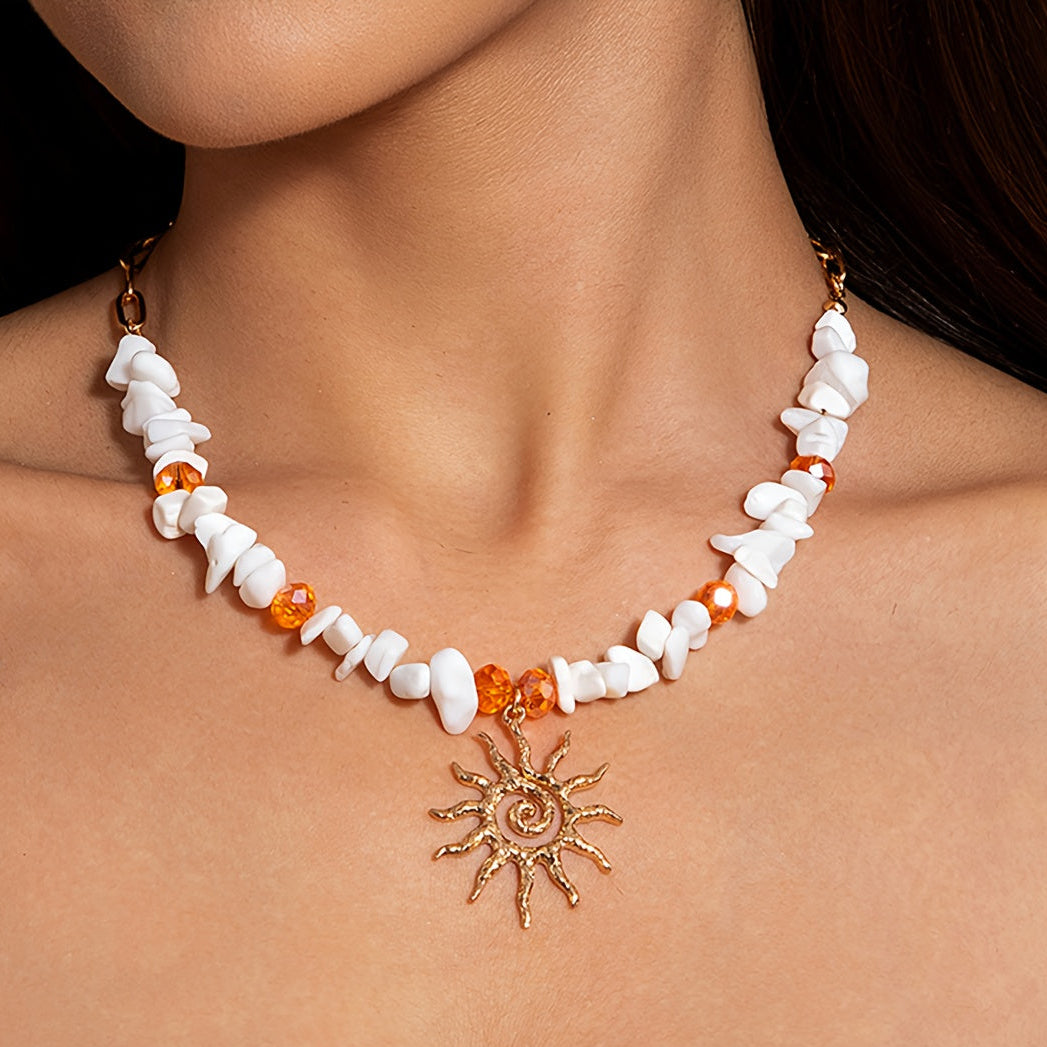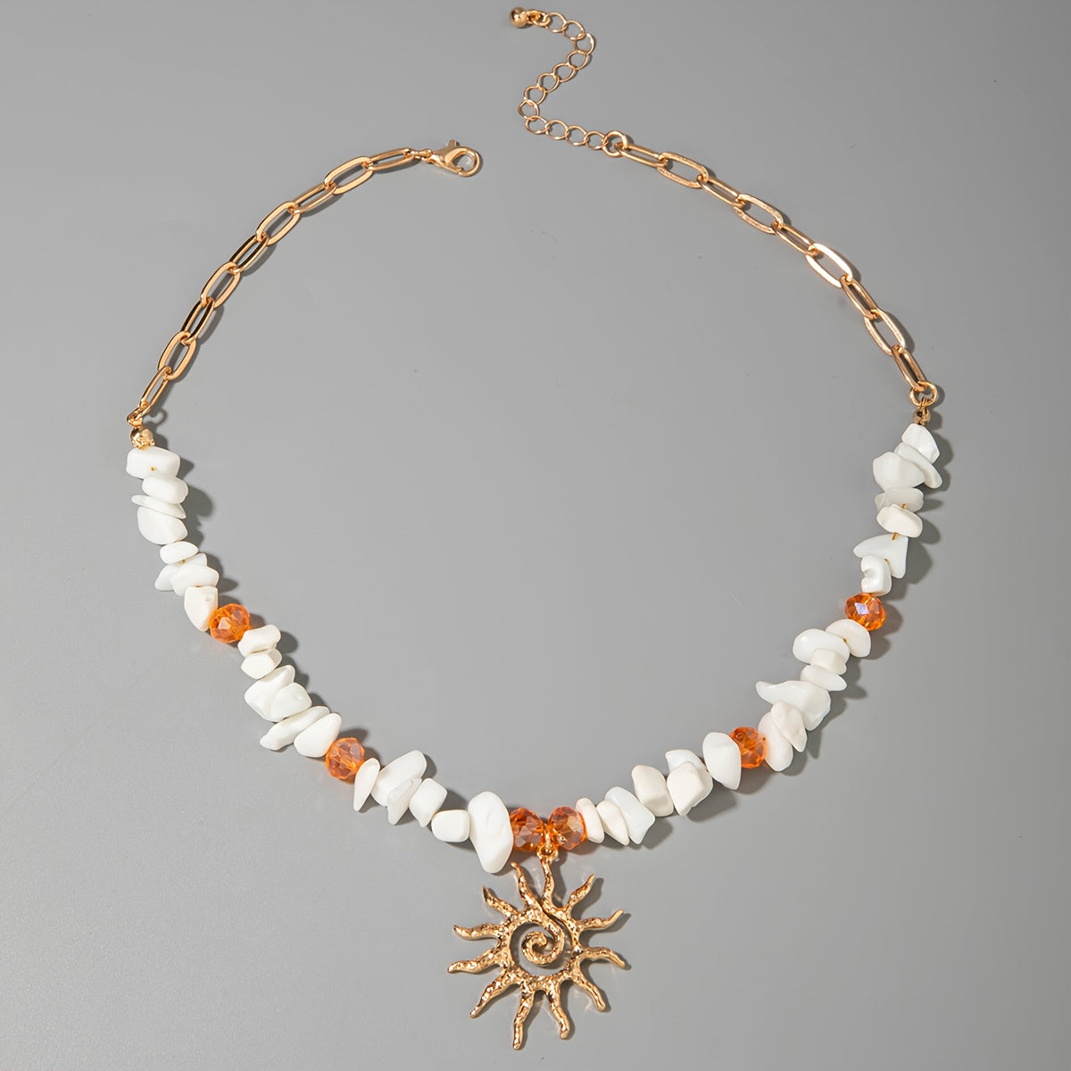 ✨ Colgante espiral solar en un collar de cuentas, con acabado en metal dorado.