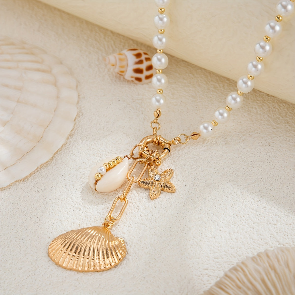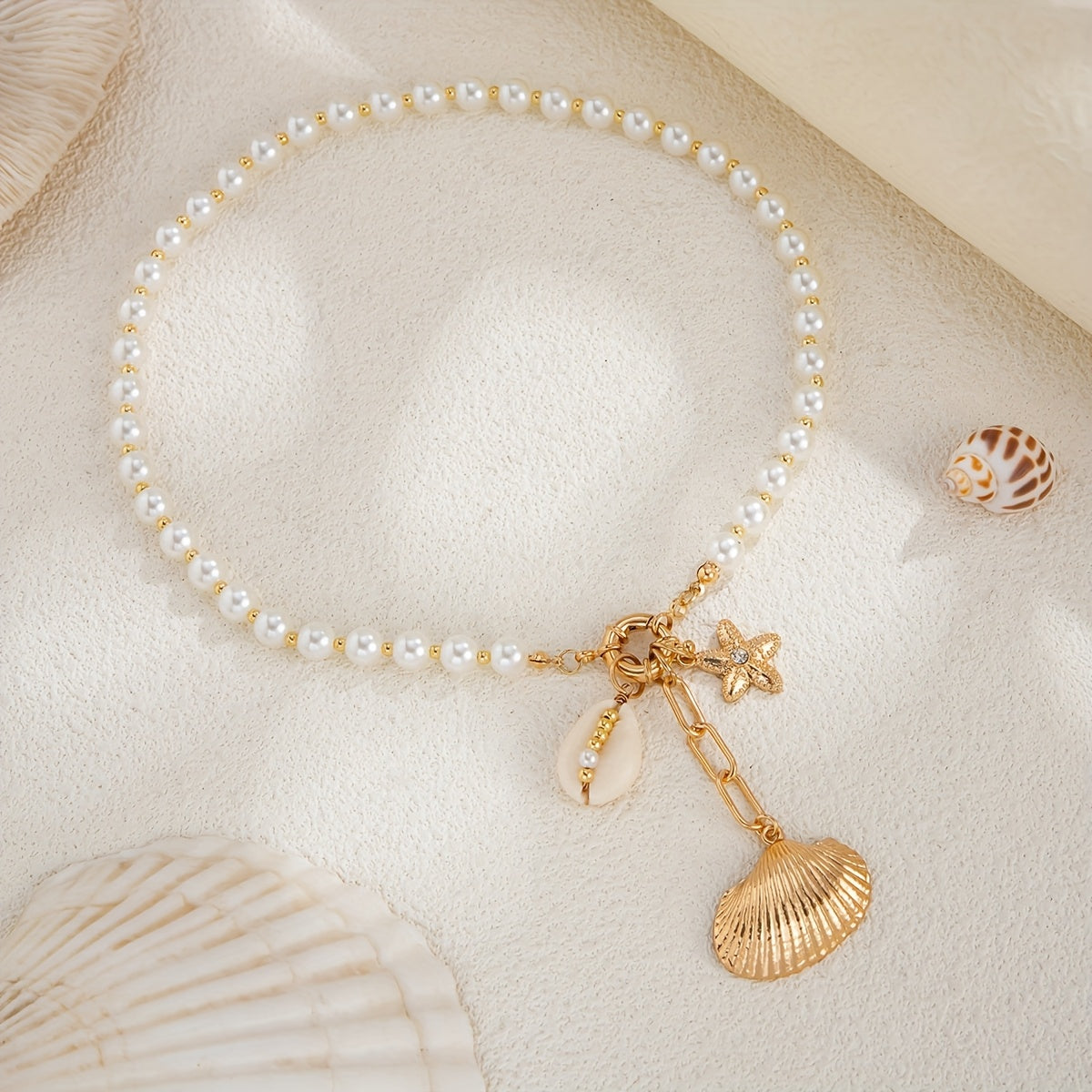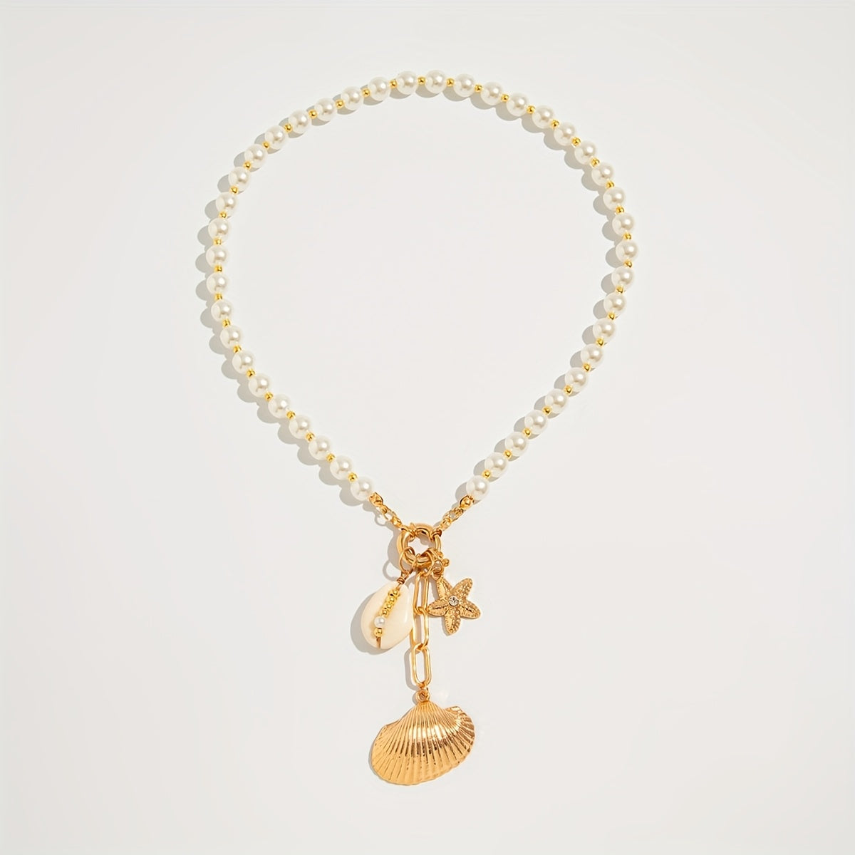 Materiales: Aleación de zinc (tono dorado); cuentas de perlas sintéticas; detalles de vidrio/acrílico.