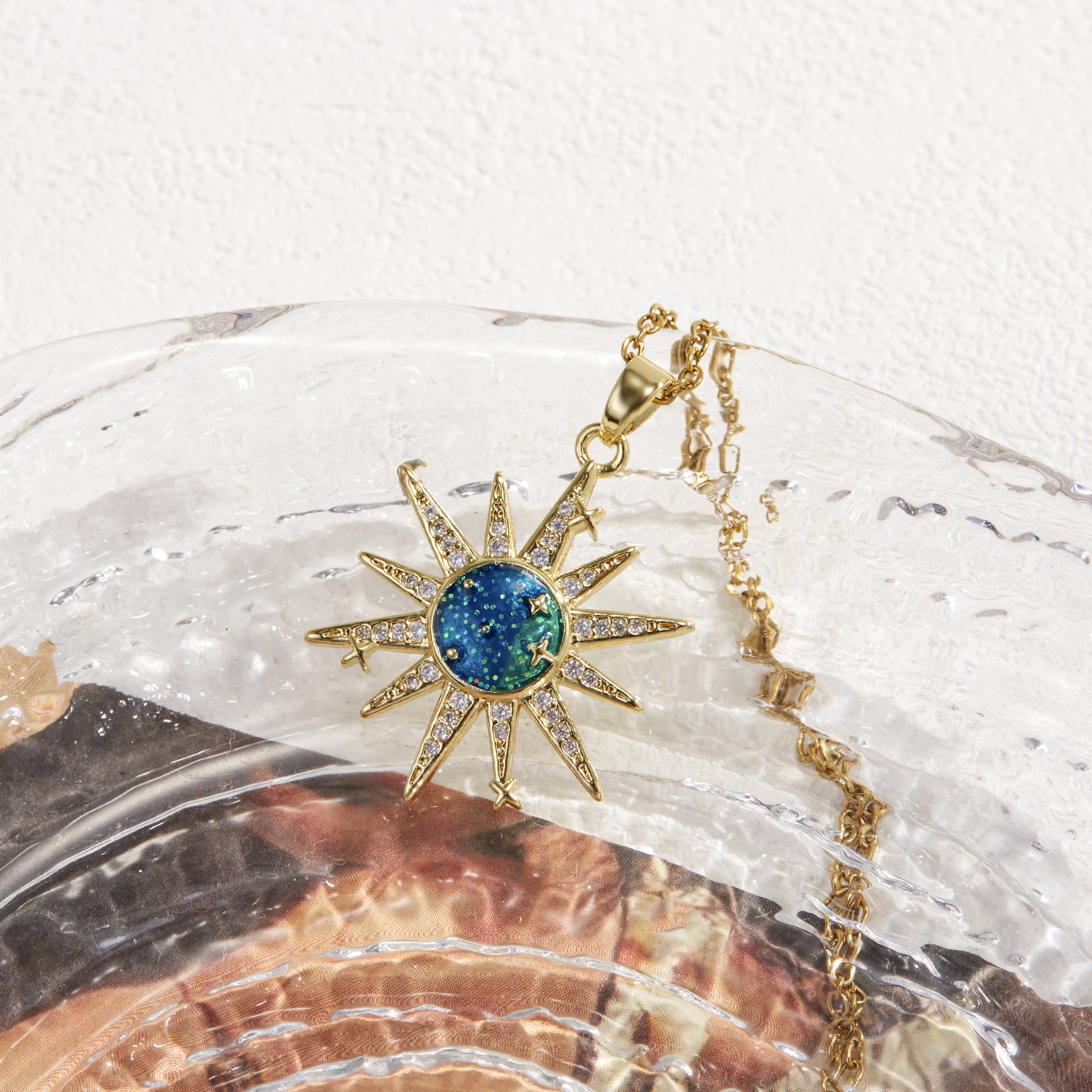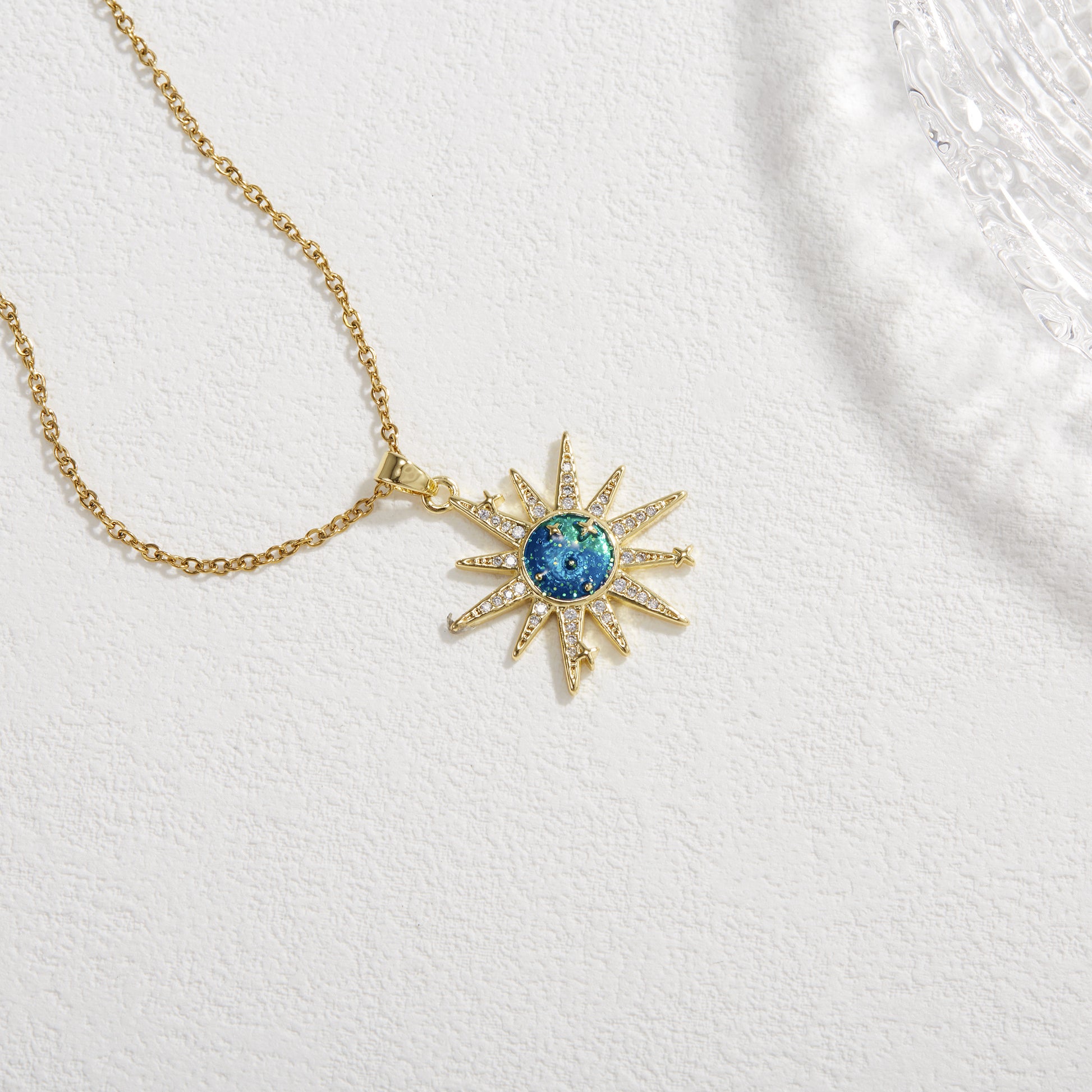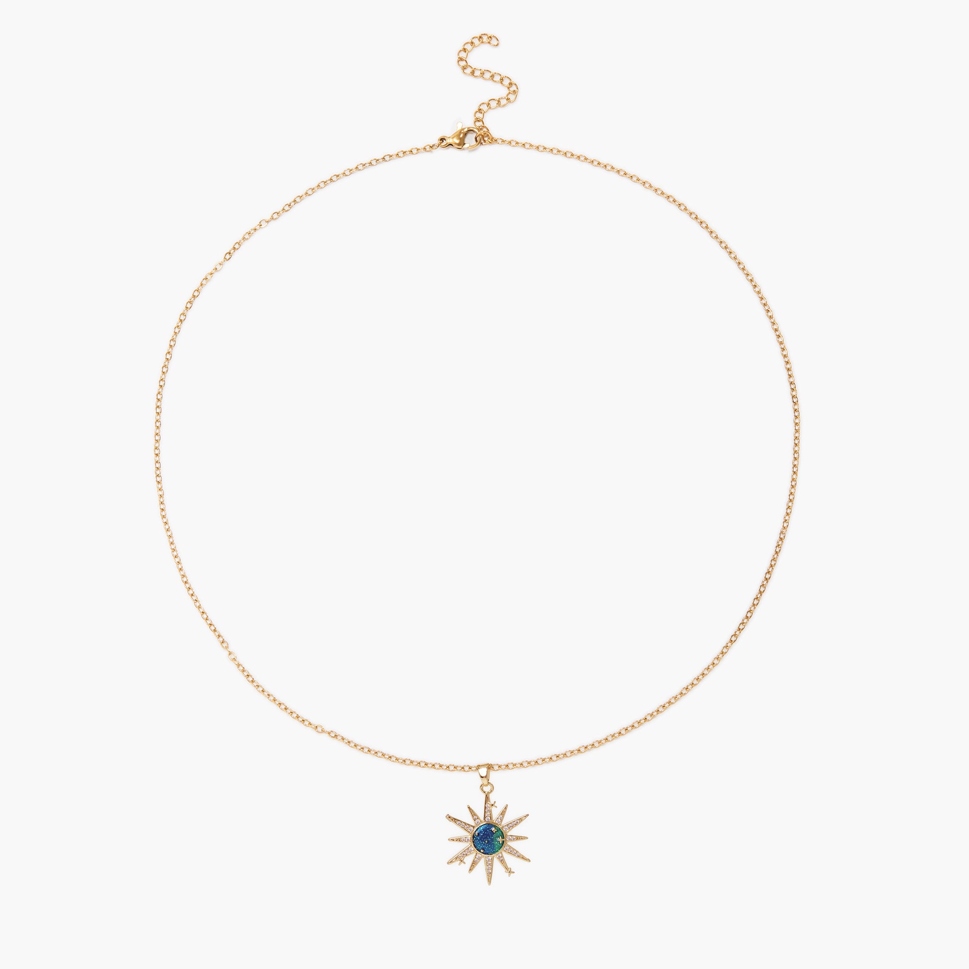 ✨ Colgante Sunburst con centro azul iridiscente y detalles de circonitas cúbicas en una cadena de acero inoxidable dorado.