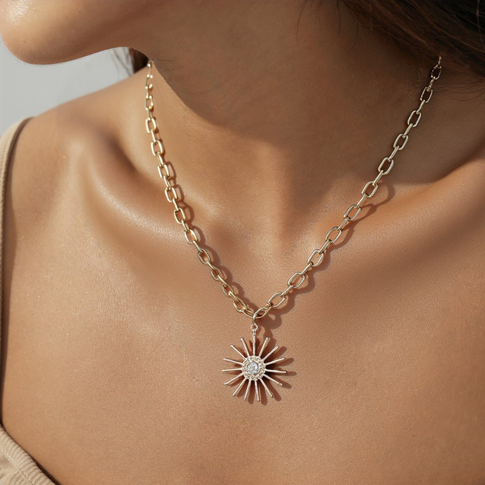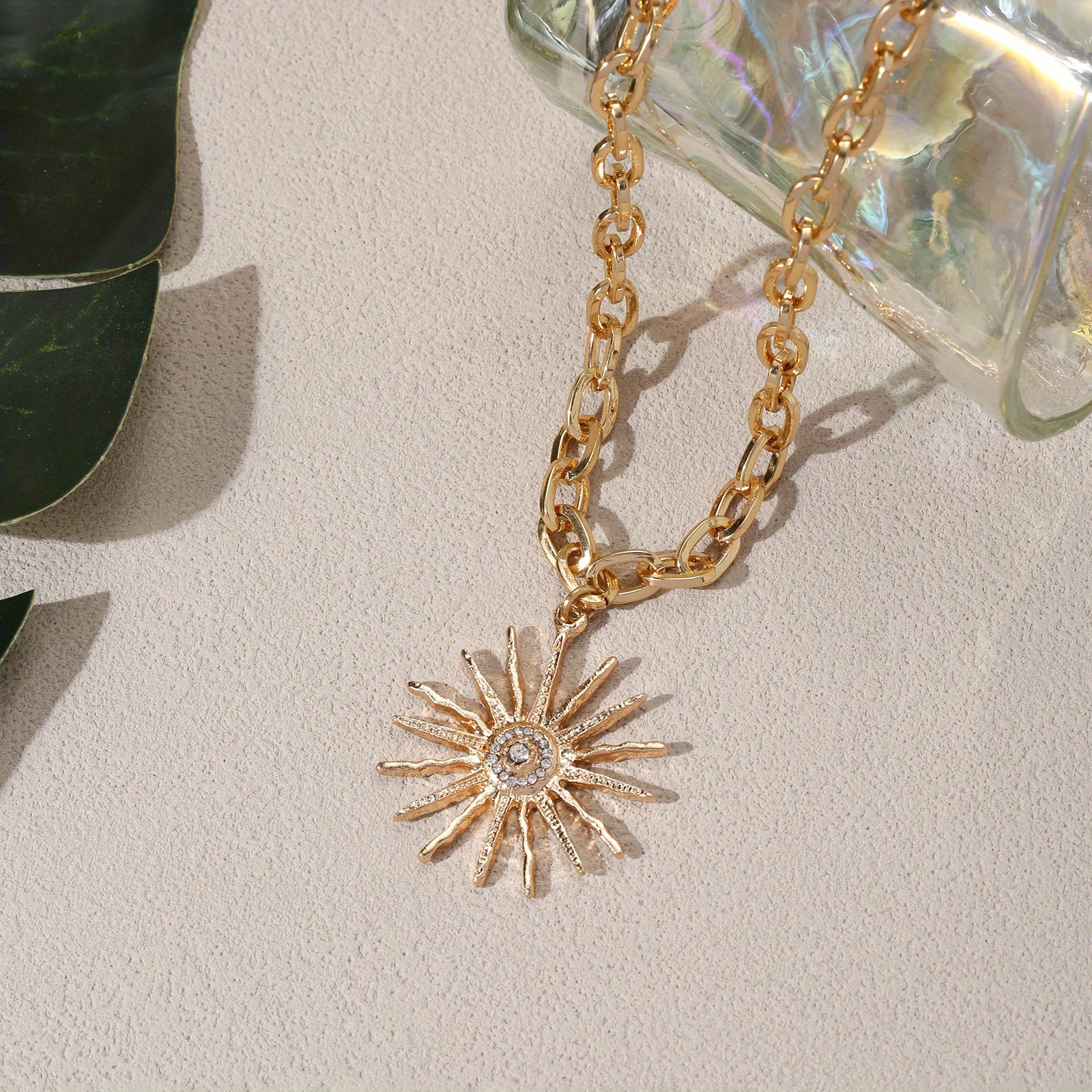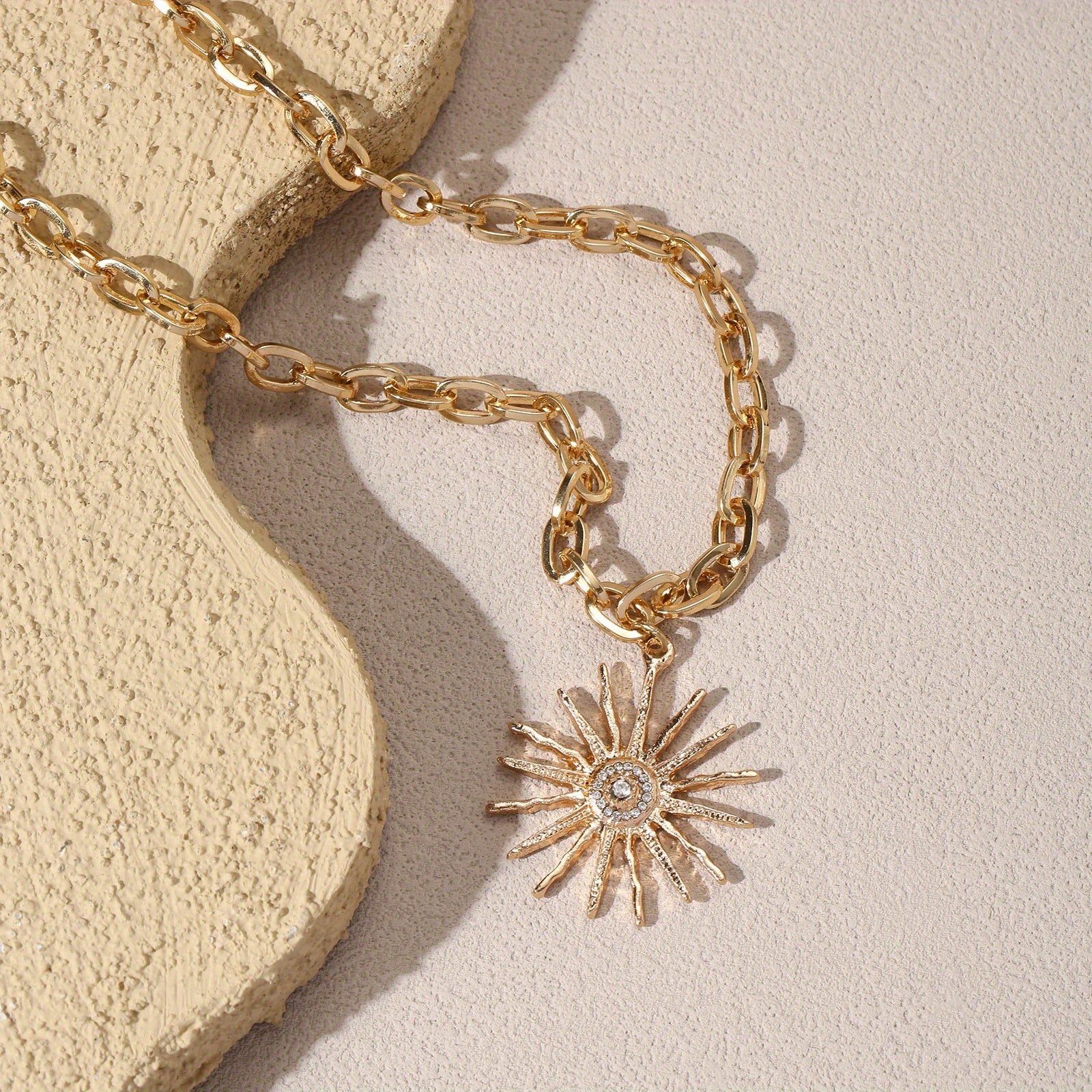 ✨ Colgante Sunburst en una gruesa cadena de acero inoxidable 304L en tono dorado.
