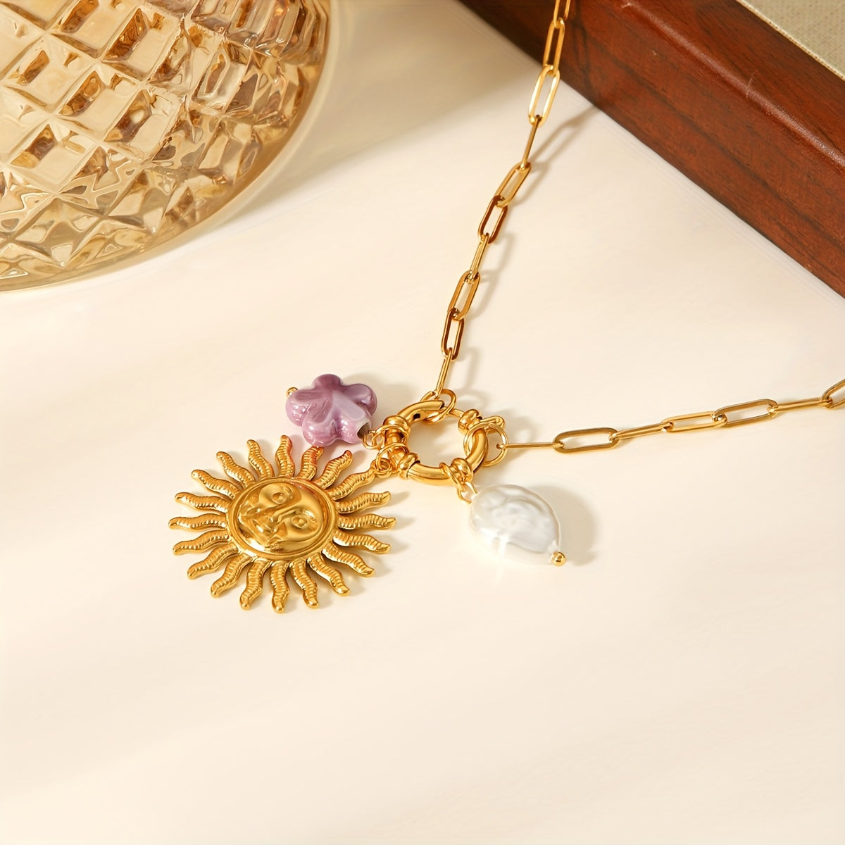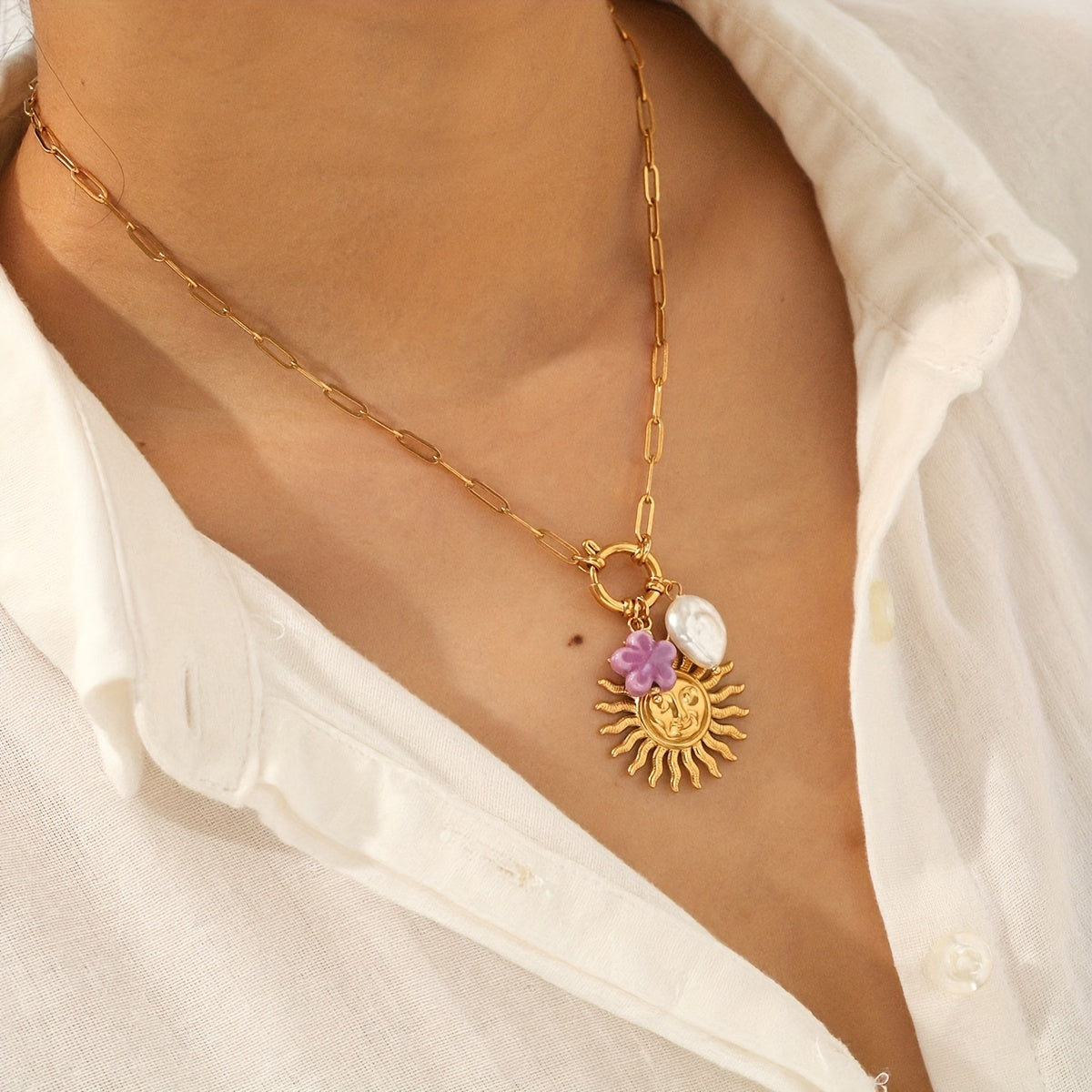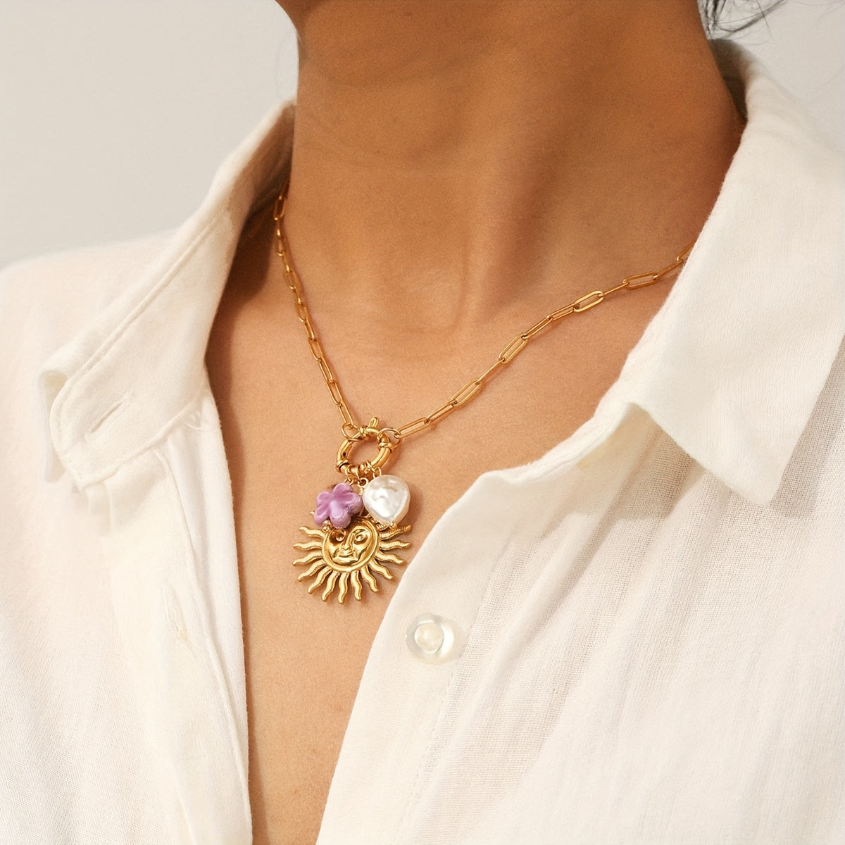 Medallón solar llamativo combinado con un camafeo blanco tallado y un dije de flor lila en una gruesa cadena dorada.