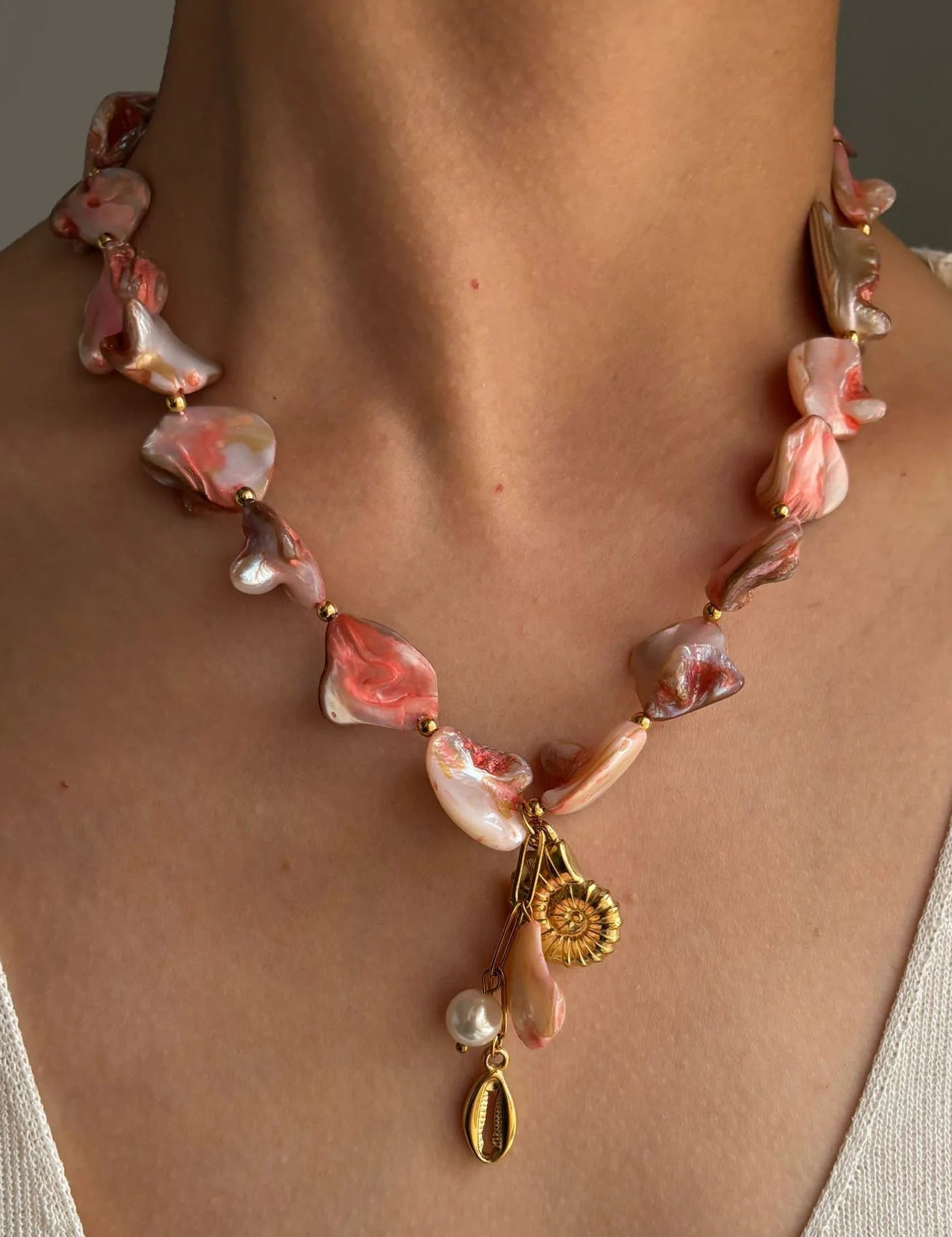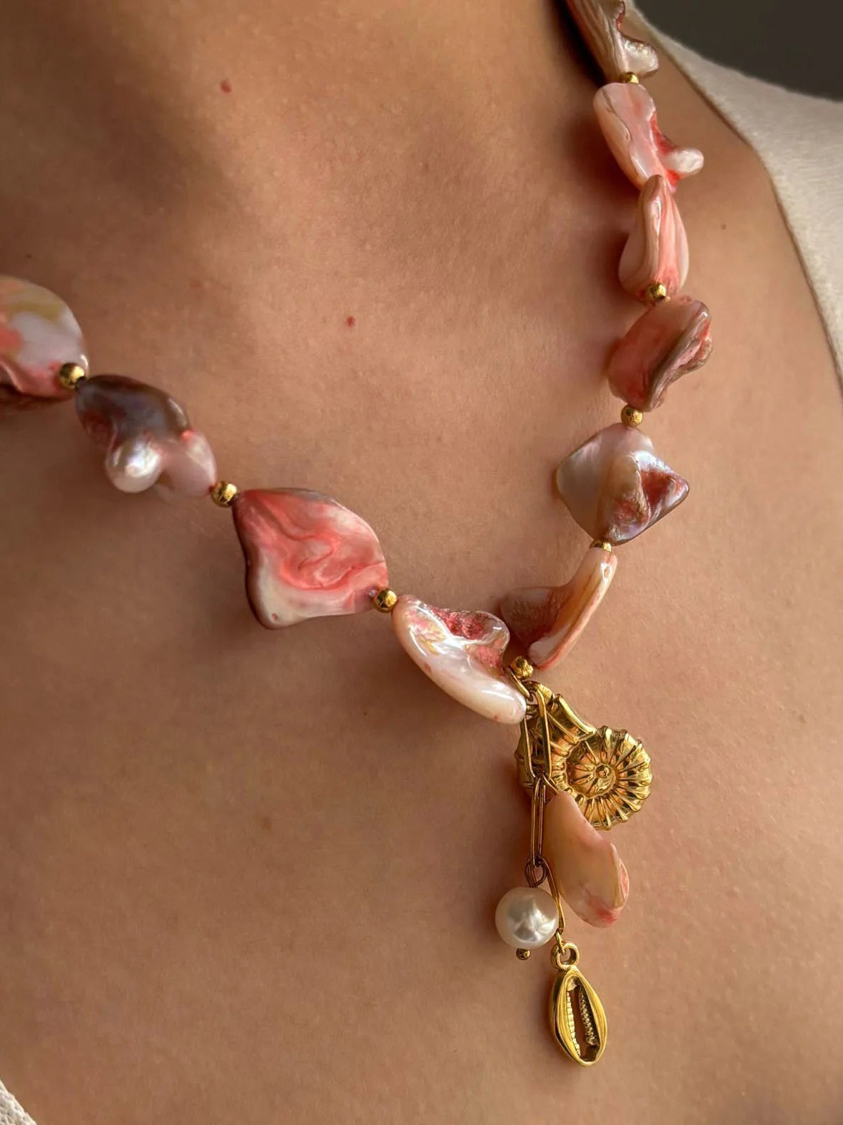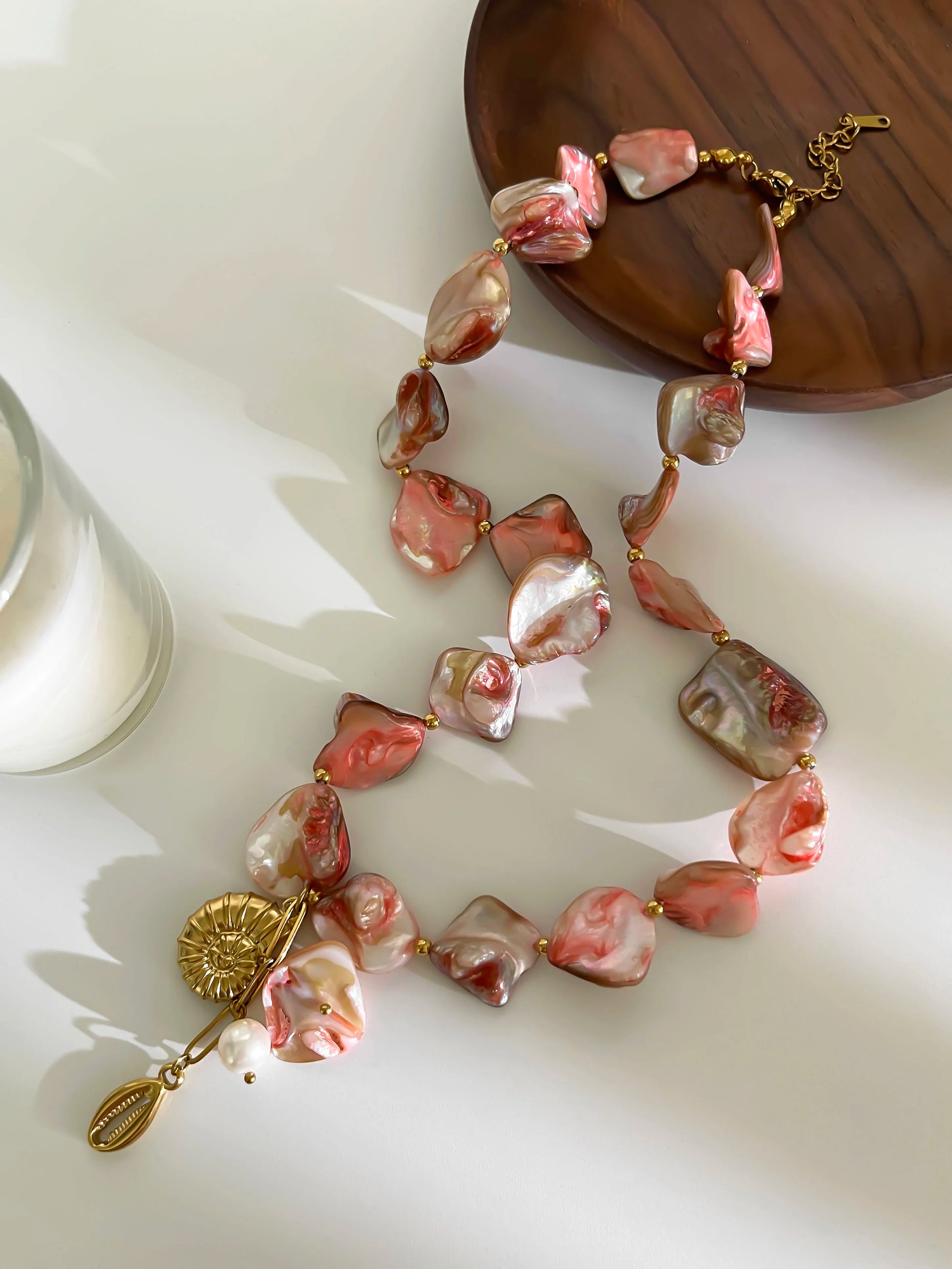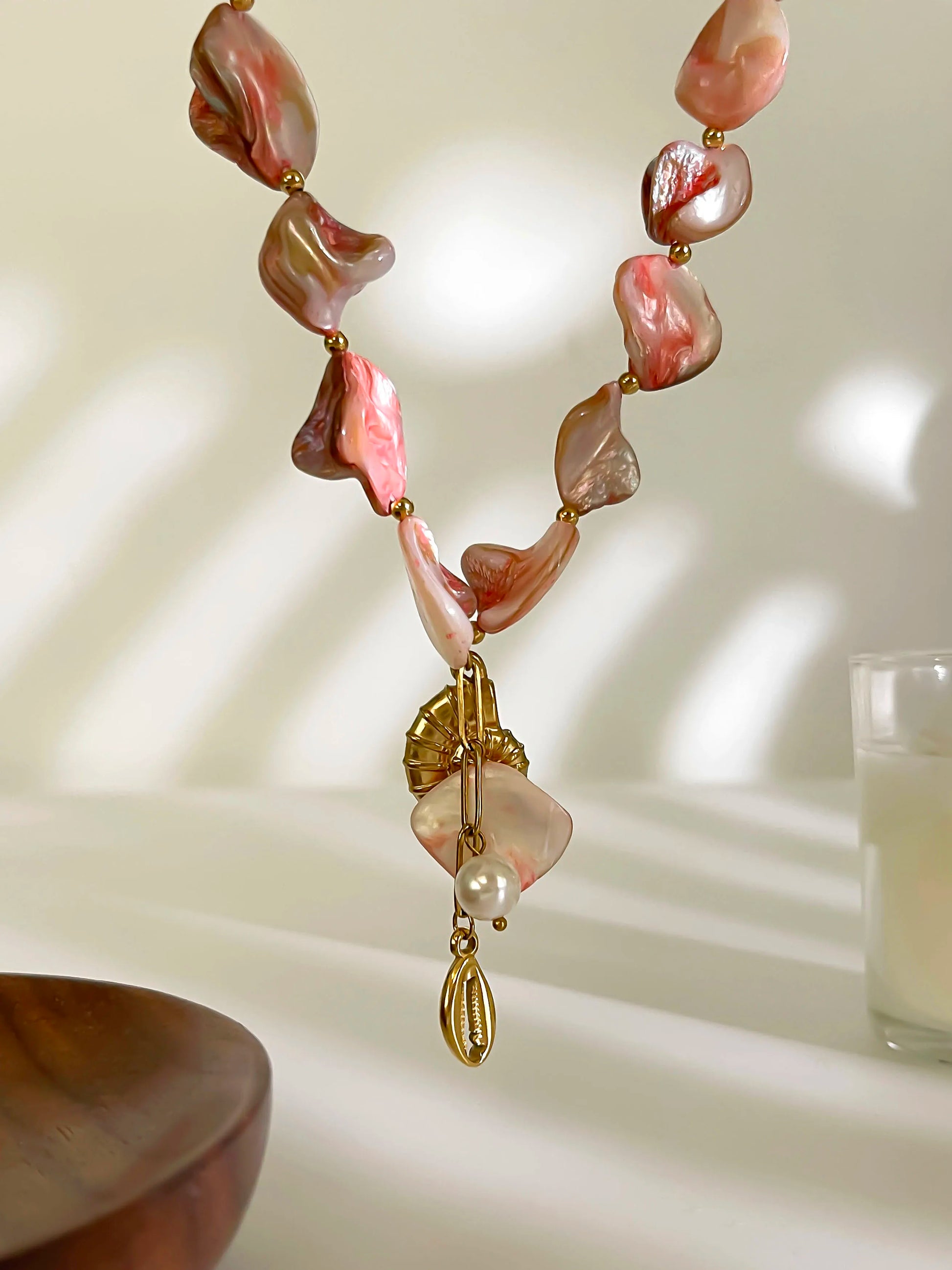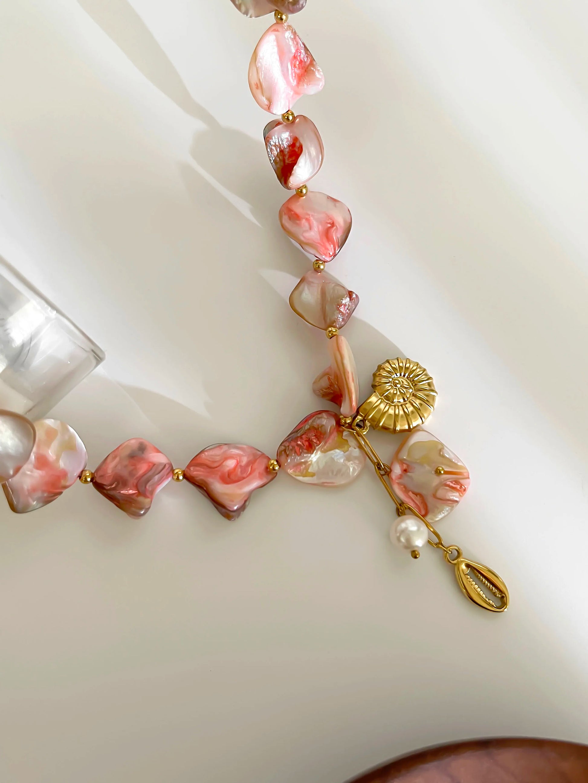 Materiales: Acero inoxidable (tono dorado); cuentas de acrílico/vidrio; perla sintética; dije estilo concha de cauri.