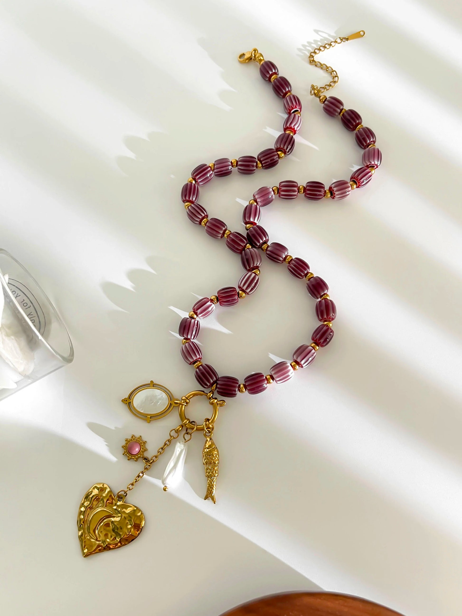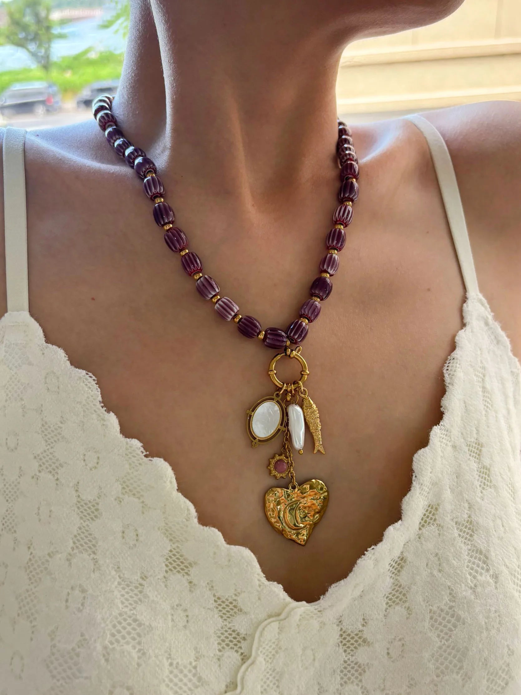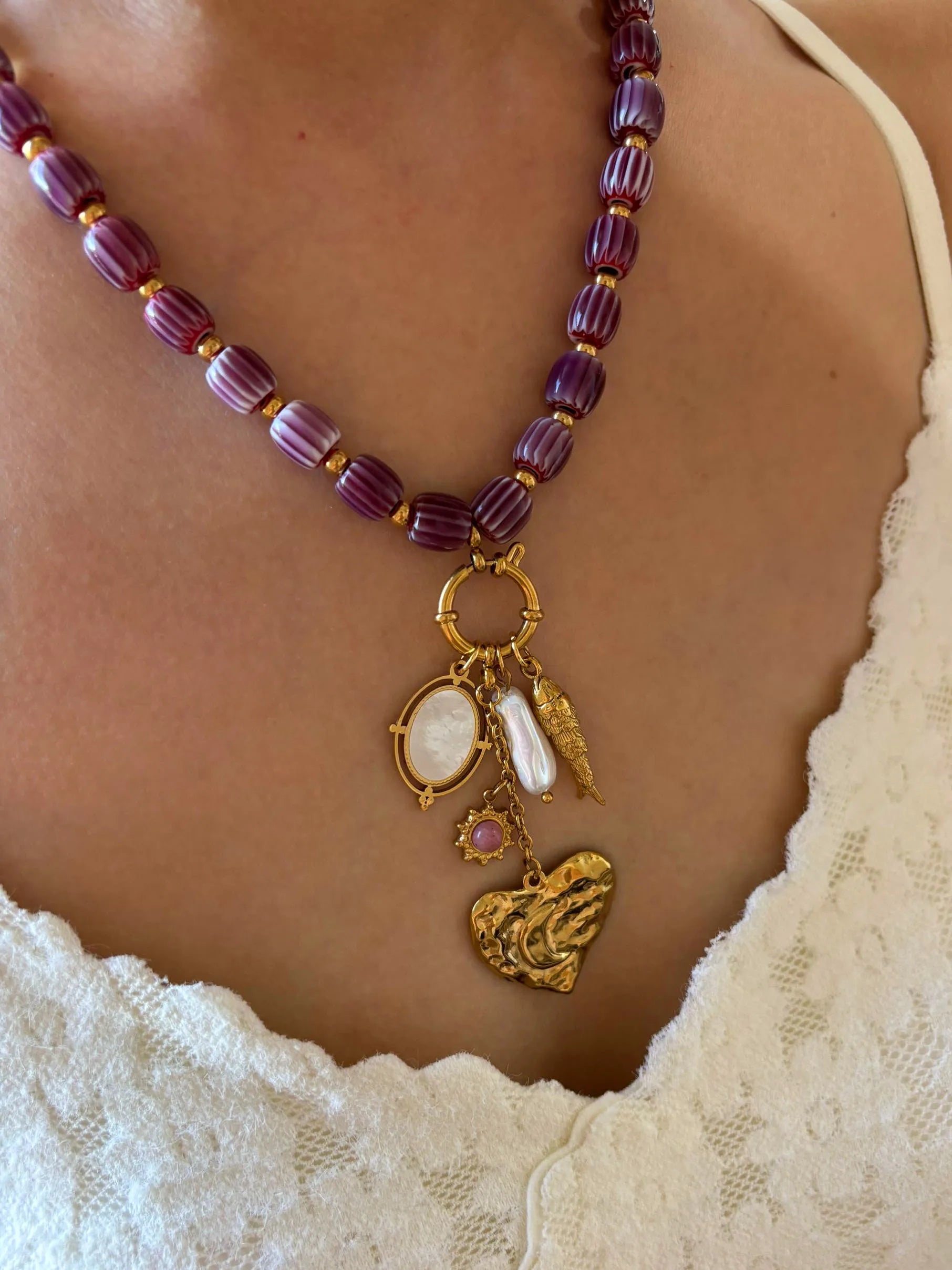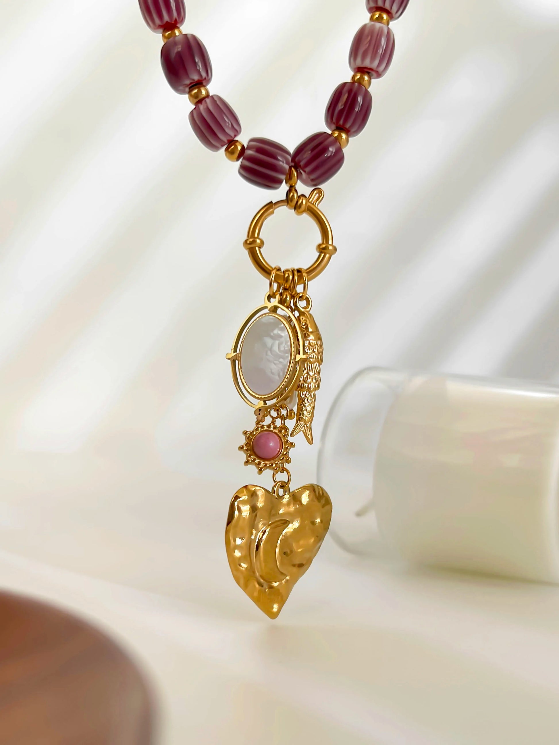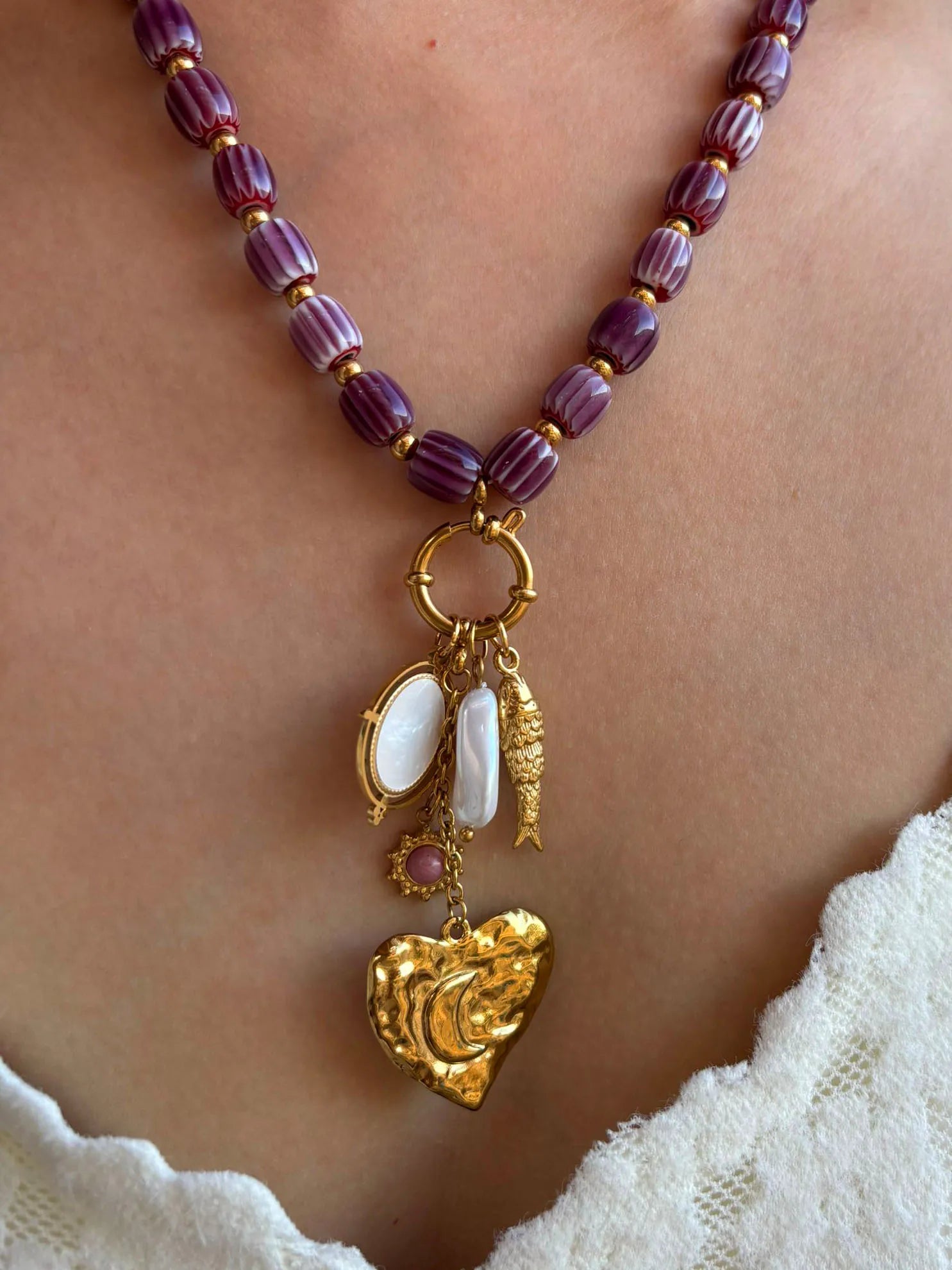 ✨ Collar con dije de corazón de acero inoxidable dorado y detalle de perla sobre cuentas violetas.