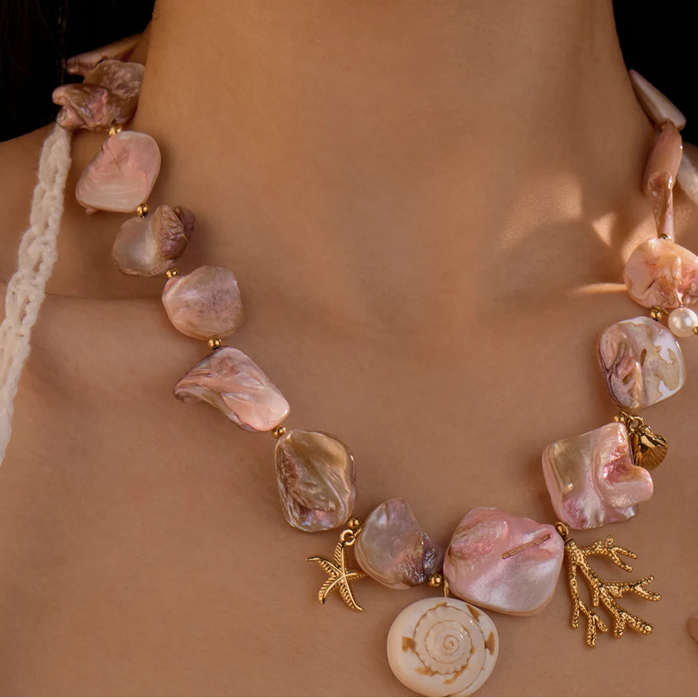 Materiales: Acero inoxidable (tono dorado); cuentas irregulares de acrílico/vidrio; perlas sintéticas; detalles estilo concha.