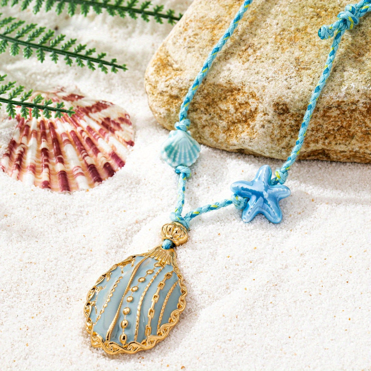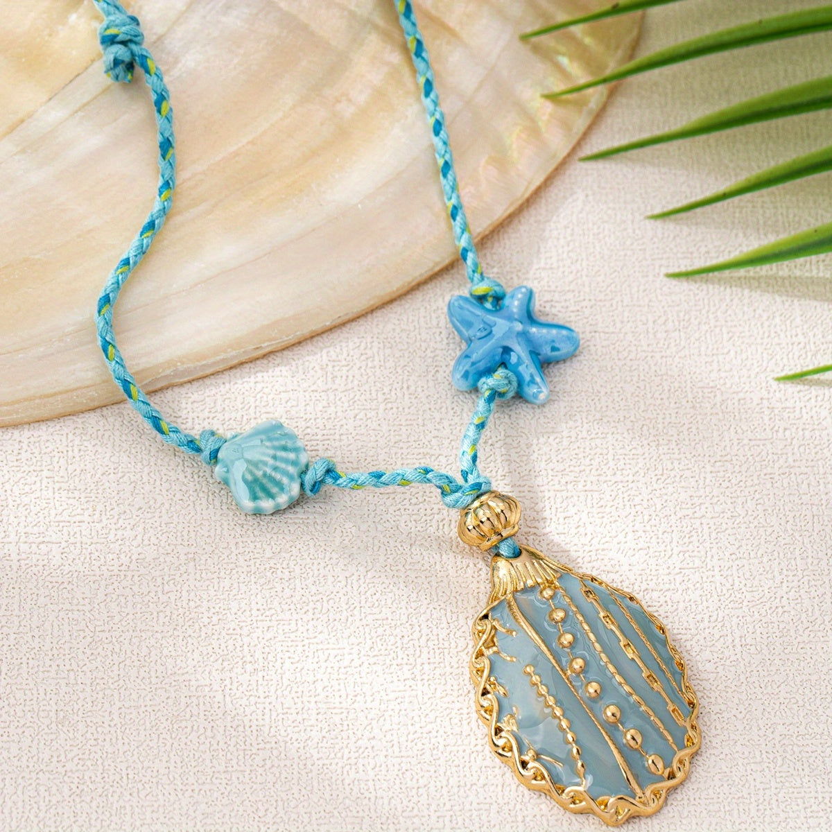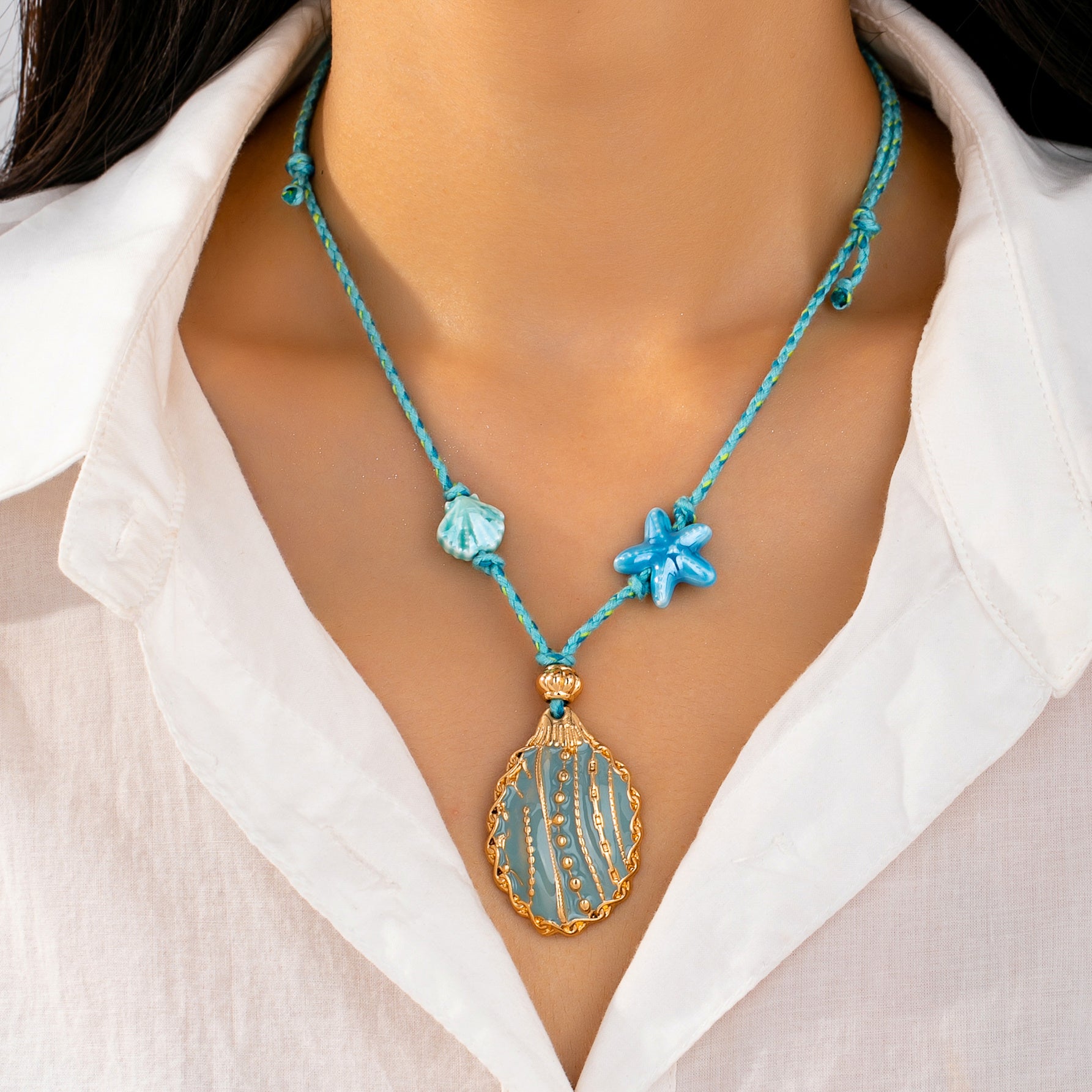 ✨ Colgante de concha con detalles de filigrana y un dije de estrella de mar en un cordón trenzado.