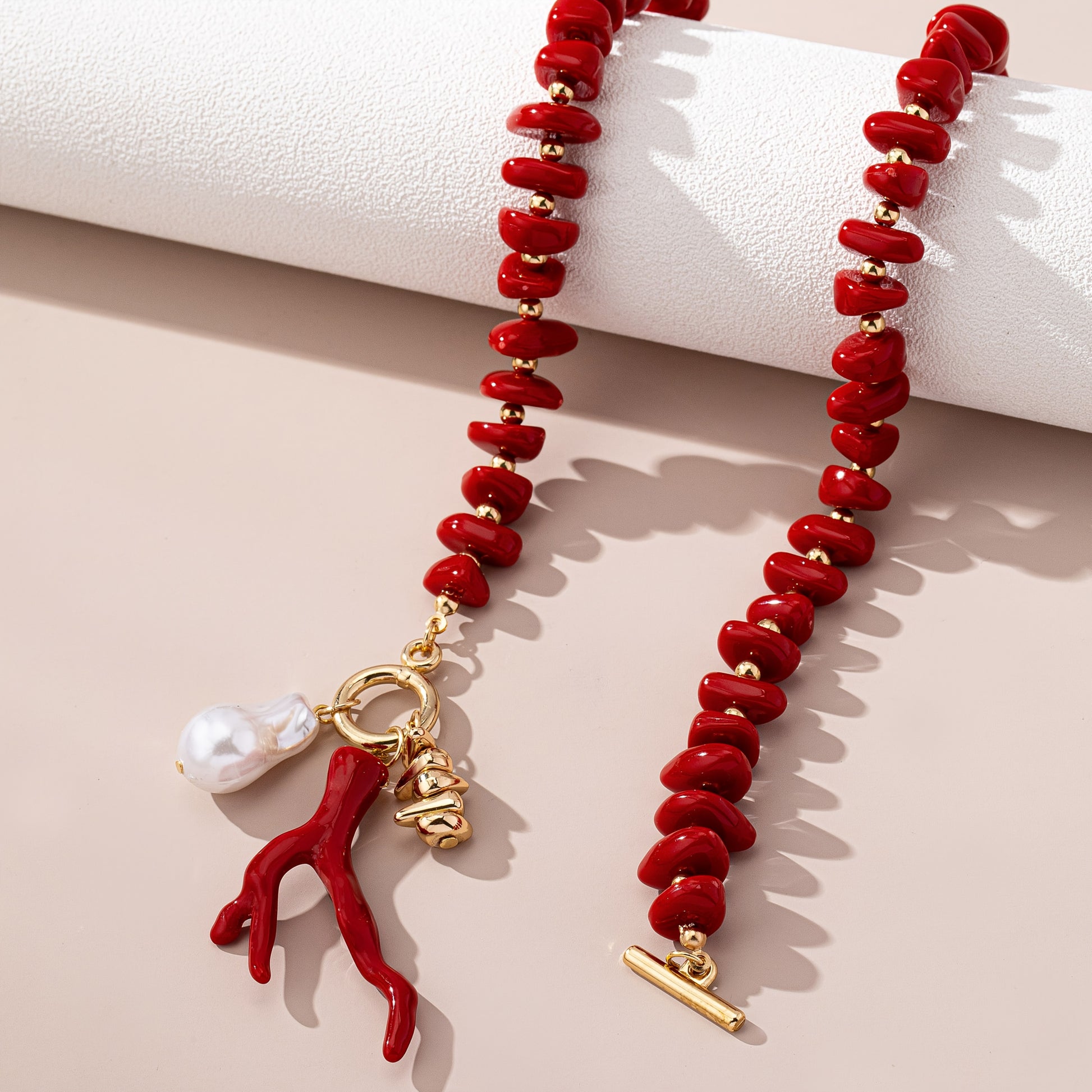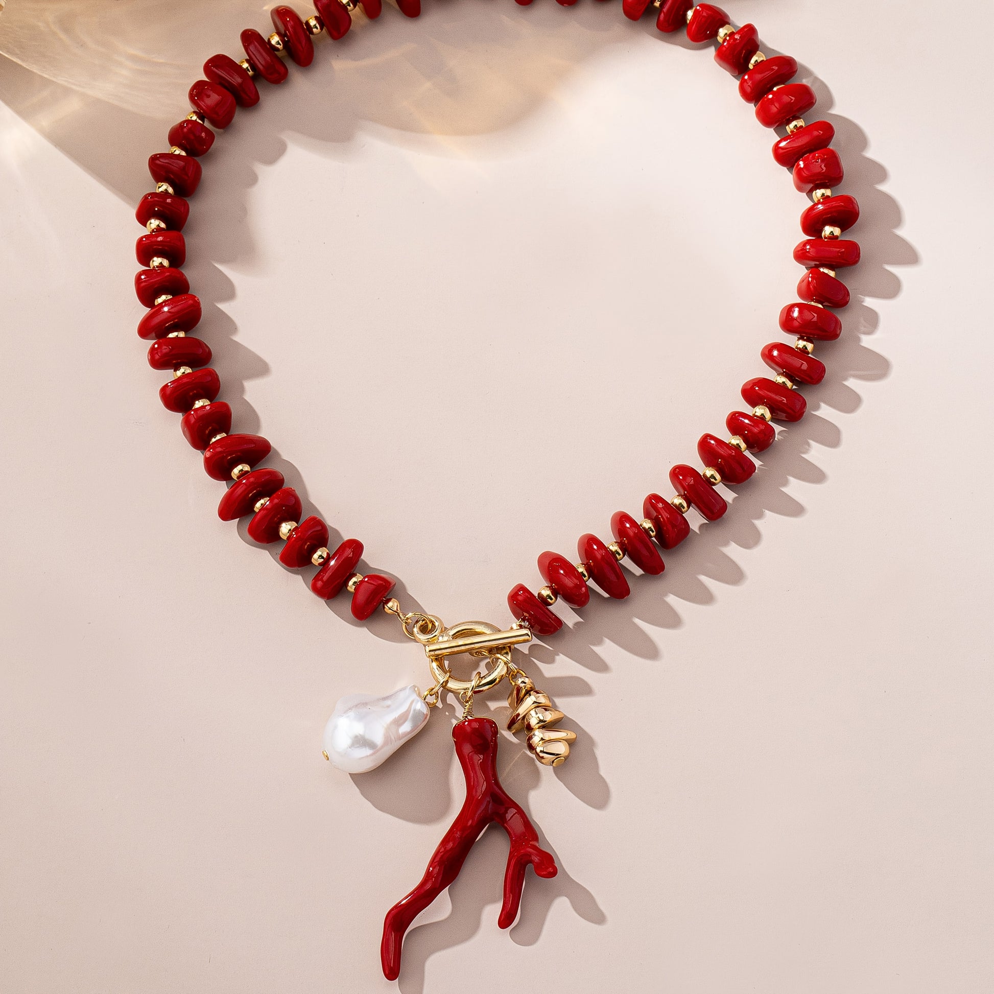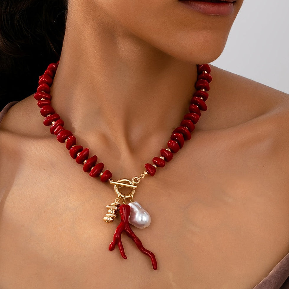 ✨ Colgante estilo coral con una gota de perla sintética en un hilo de cuentas, acabado en metal dorado.