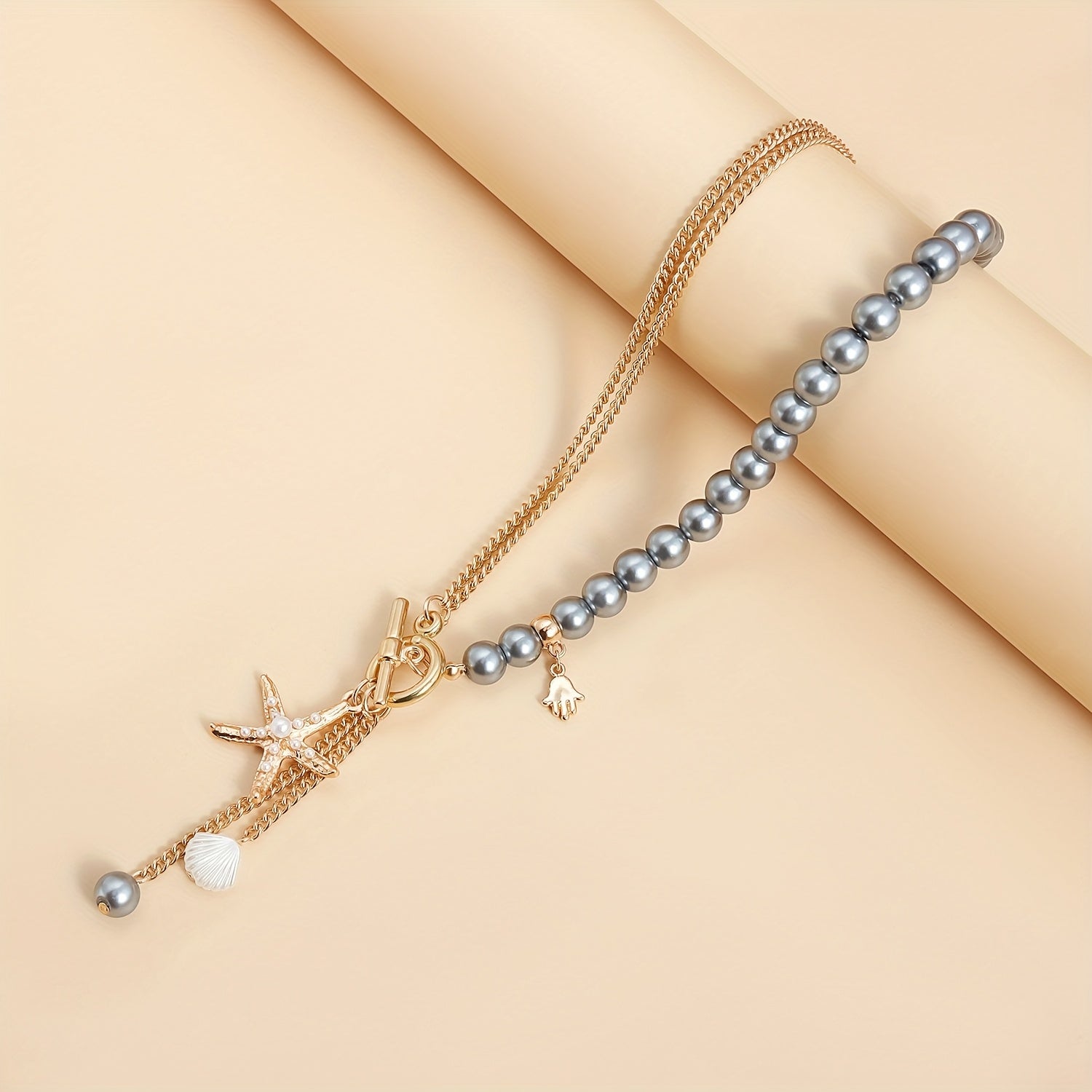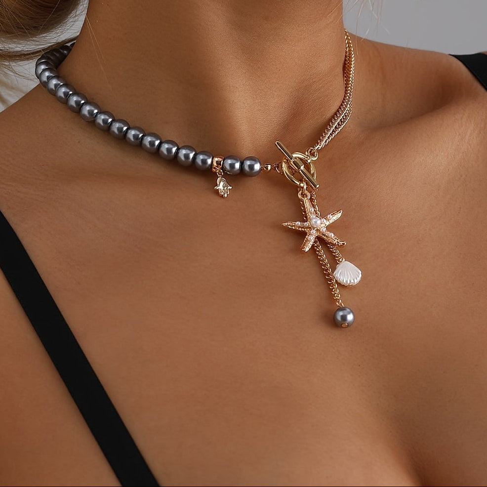 ✨ Gargantilla de perlas grises con dije de estrella de mar en tono dorado y cierre de palanca frontal.