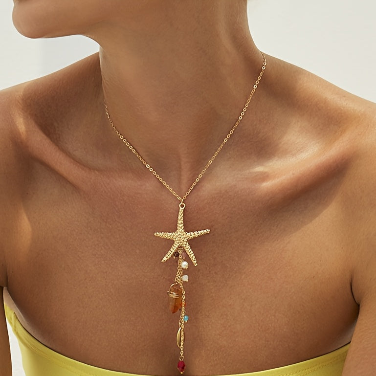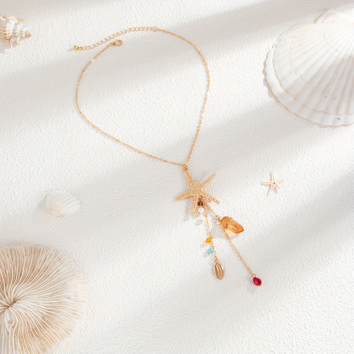 ✨ Subtle, refined shine: gold-tone starfish pendant with cascading charms—faceted glass, a cowrie-style bead and a turquoise-tone accent—on a fine chain.