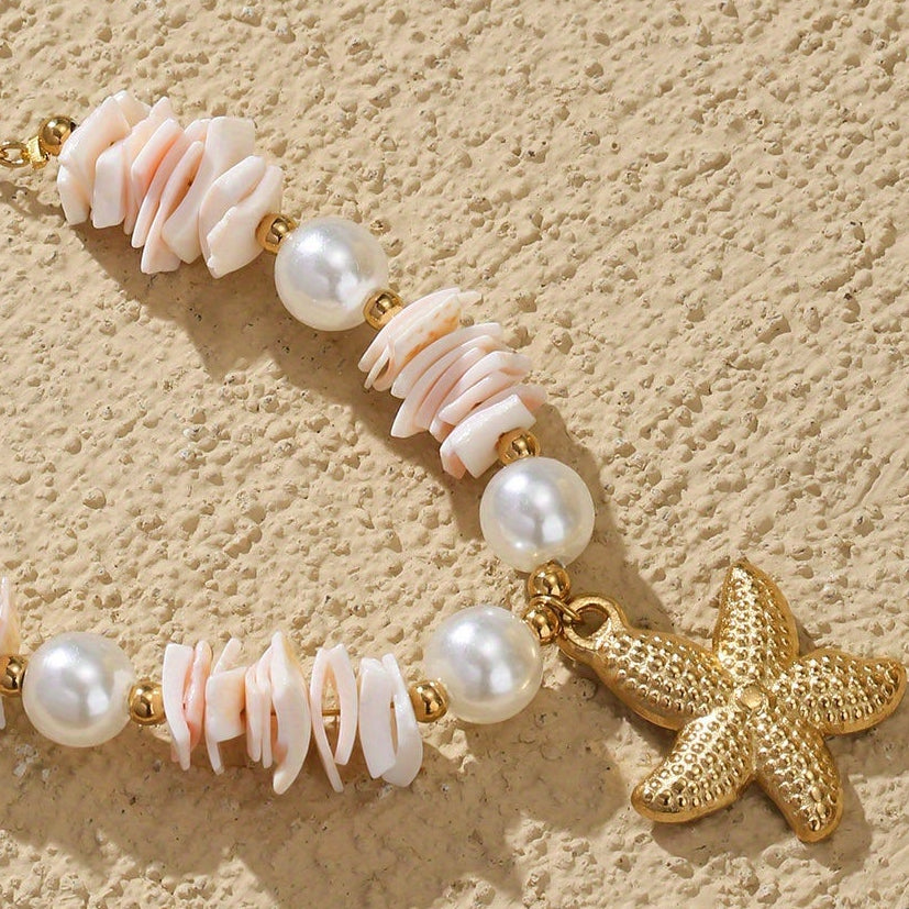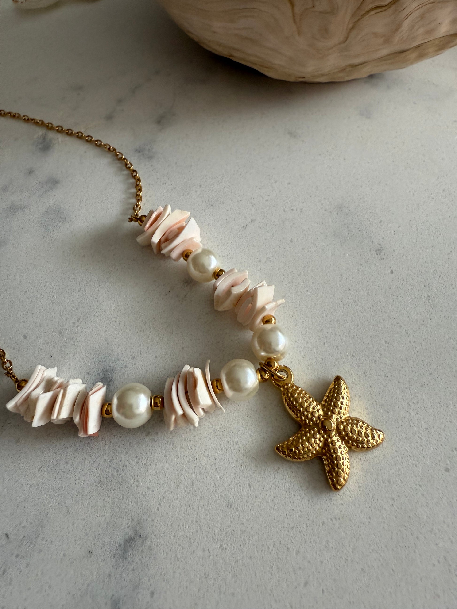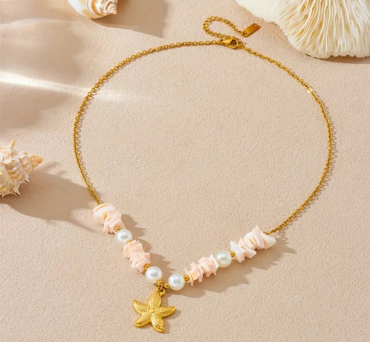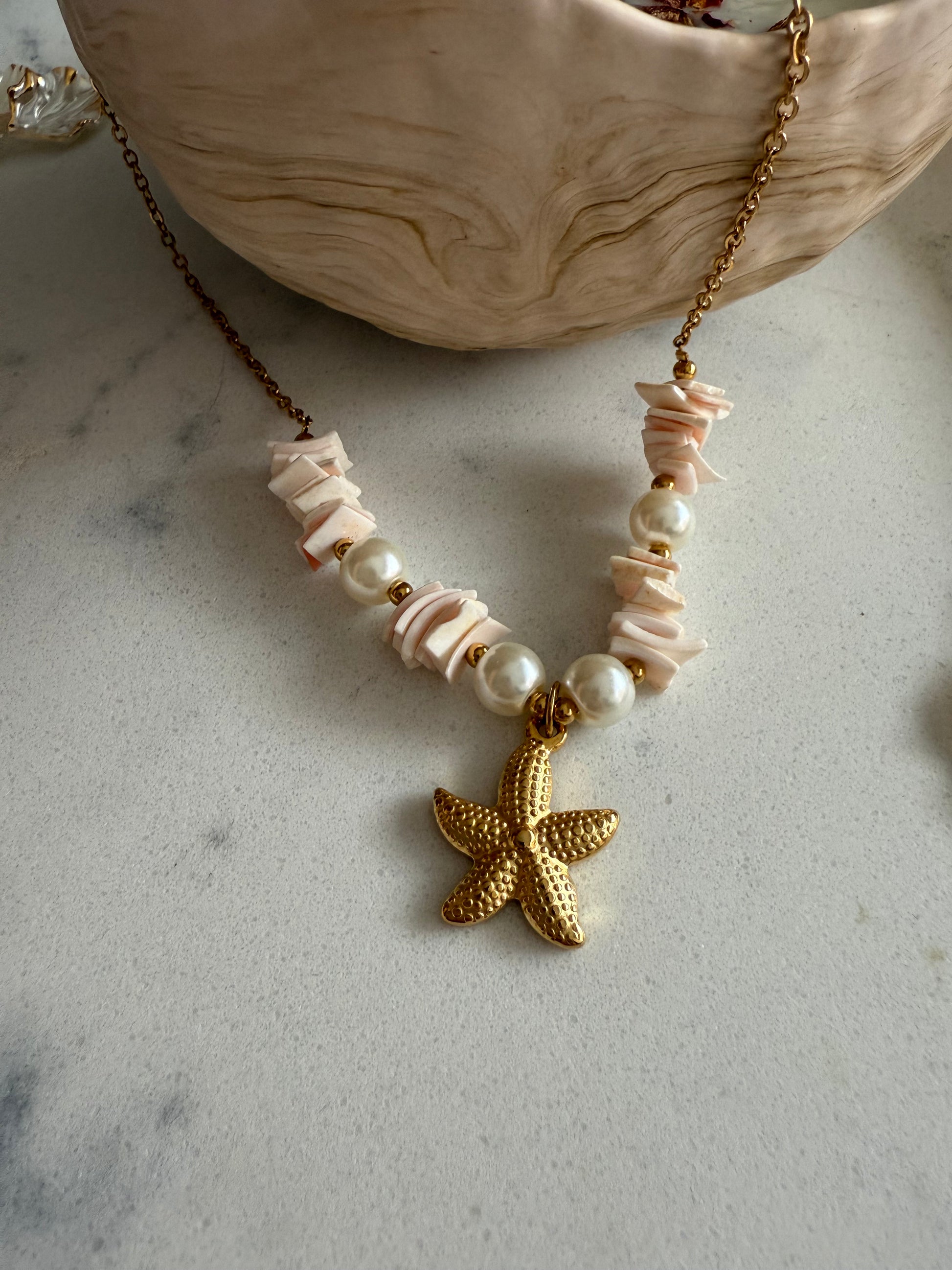 ✨ Starfish pendant on gold-tone 304L stainless steel with shell-style chips and pearls.