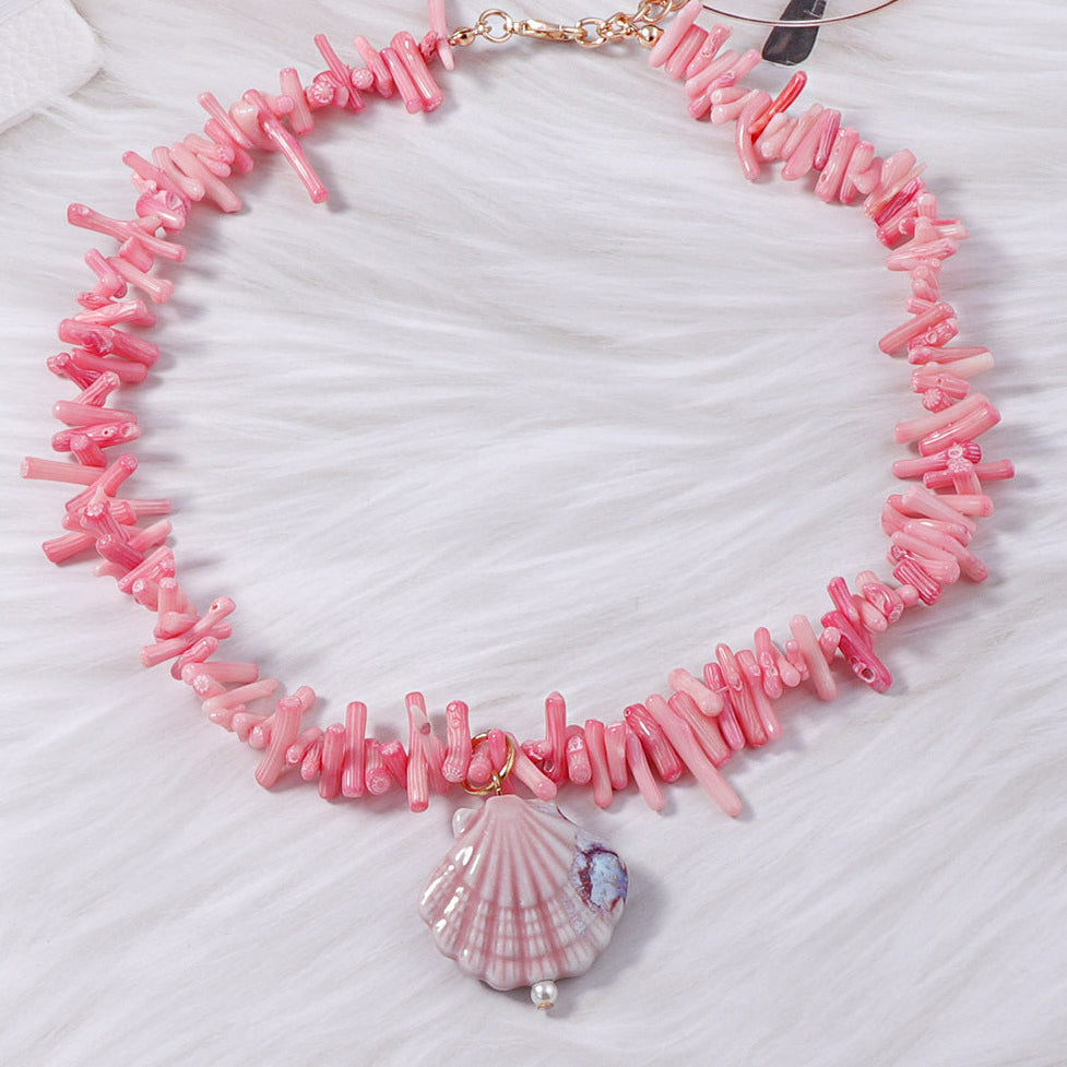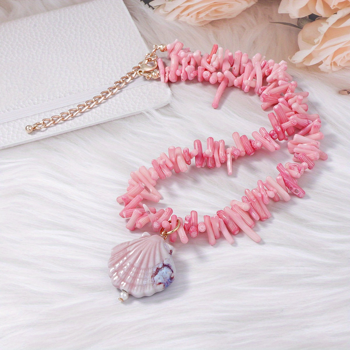 ✨ Shell pendant on a bead strand with coral-style chips and gold-tone accents.